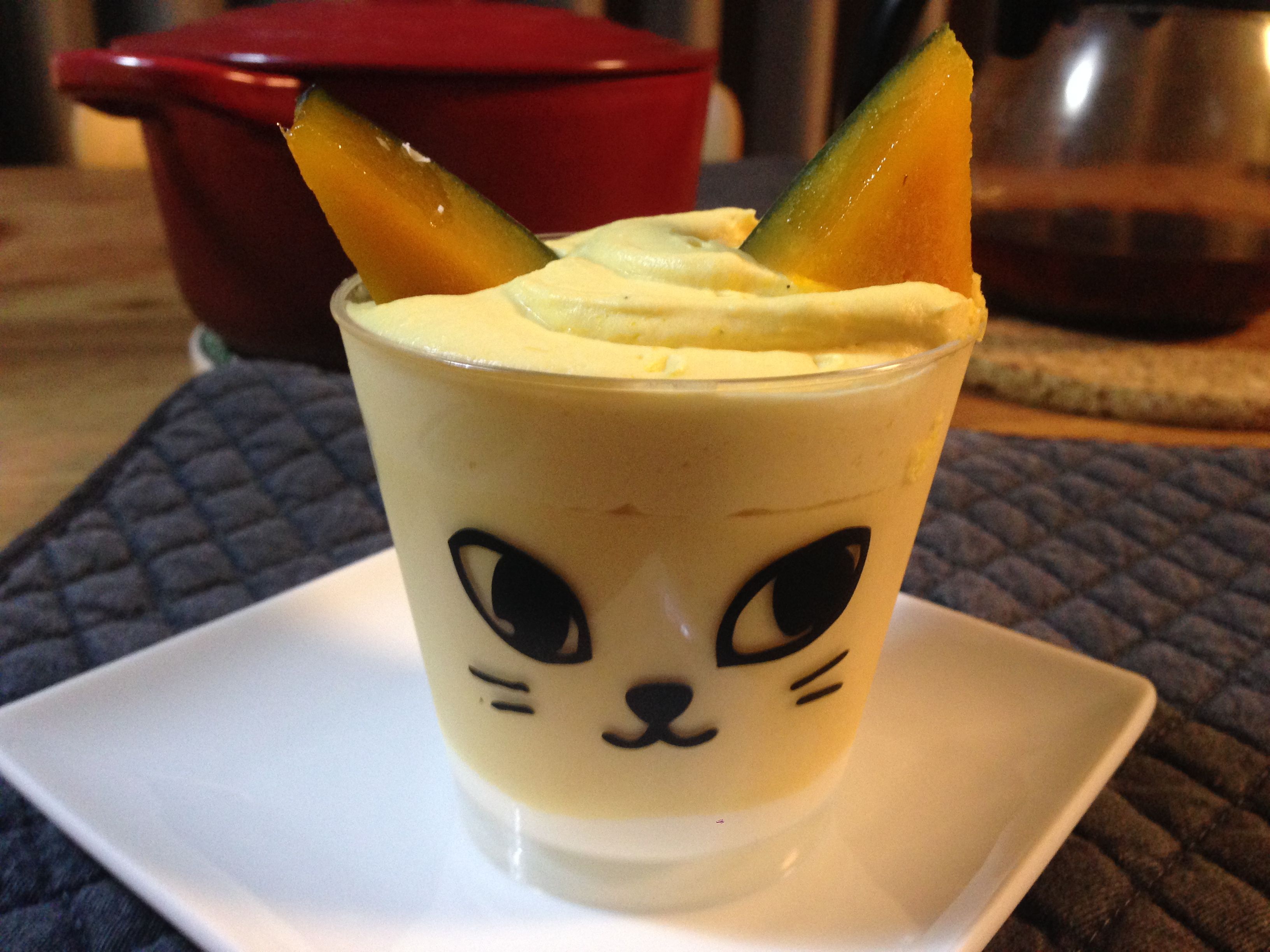 お顔としっぽが描かれた容器には、カボチャがゴロゴロ入ったチーズのような濃厚さがある生クリームの上にカボチャプリン、そしてカボチャがまたごろごろ入ったカボチャクリームが載っていて、三角のかぼちゃが猫耳として載っています