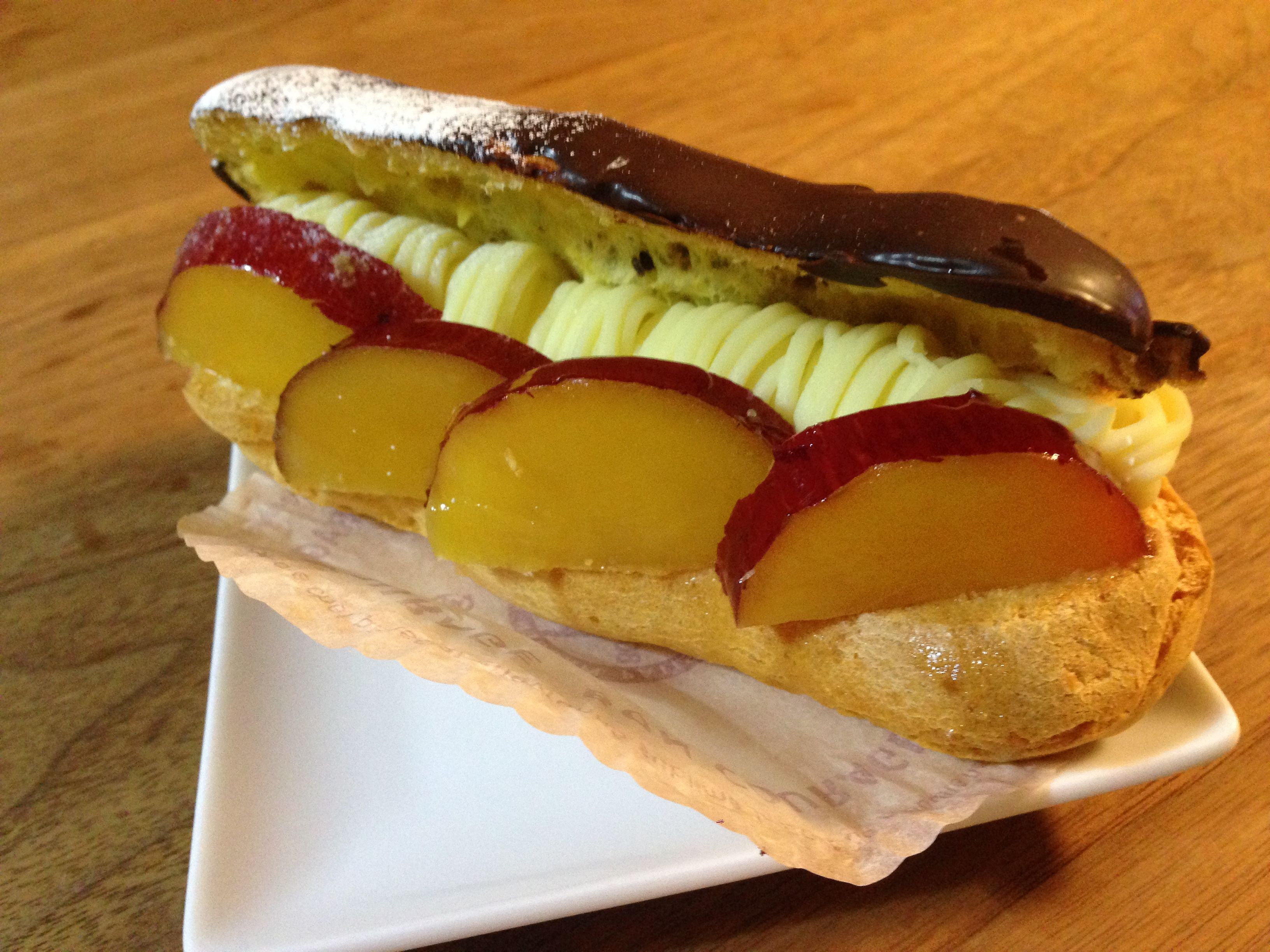 生クリームと裏ごししたさつまいものクリームが入ったエクレアに甘く煮つけたお芋の輪切りをトッピング