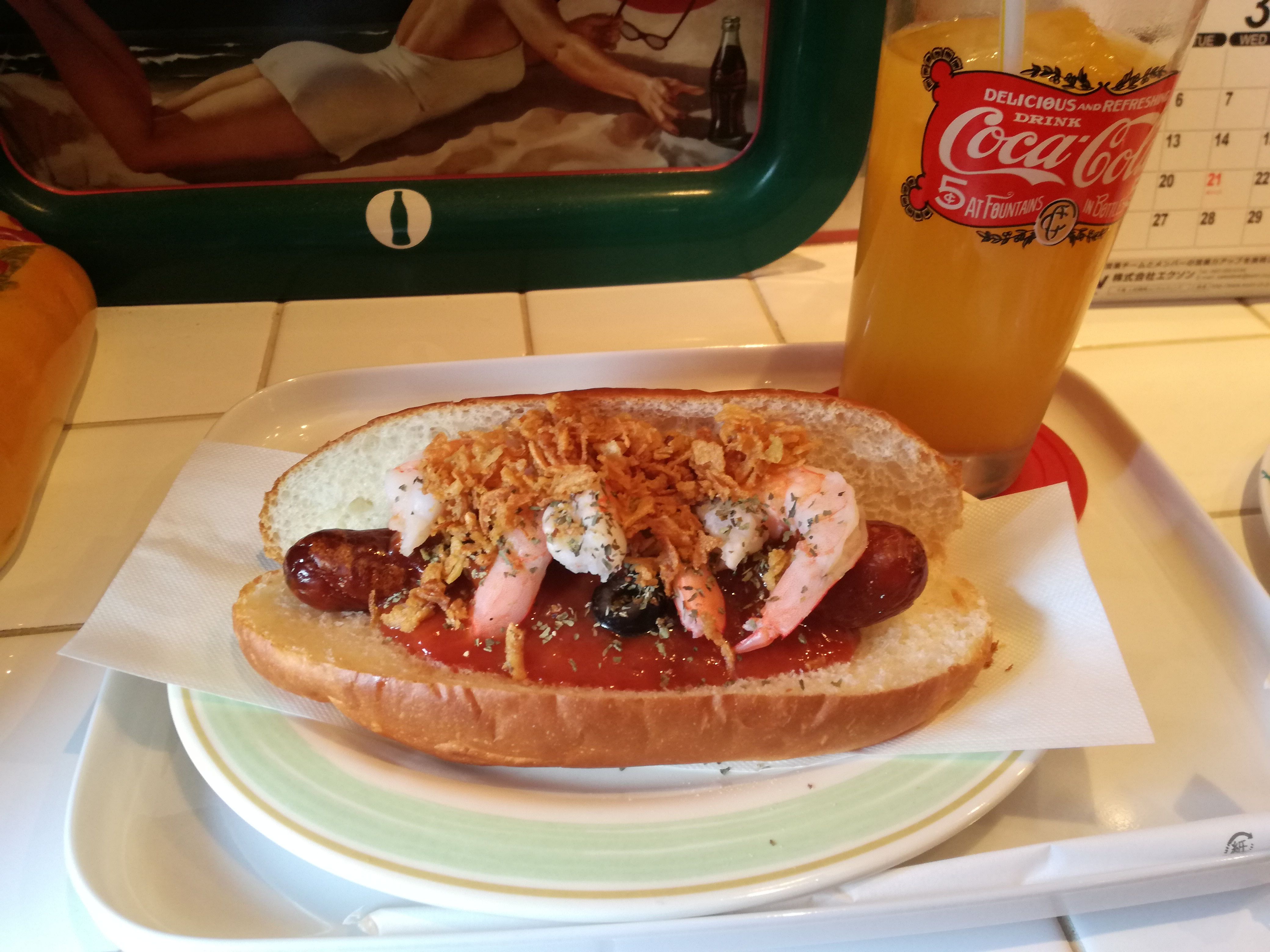 ホットドッグにはハラペーニョ、揚げ玉ねぎ、ピクルスが無料トッピングできるということなので、揚げ玉ねぎとピクルスを盛り盛りしました。