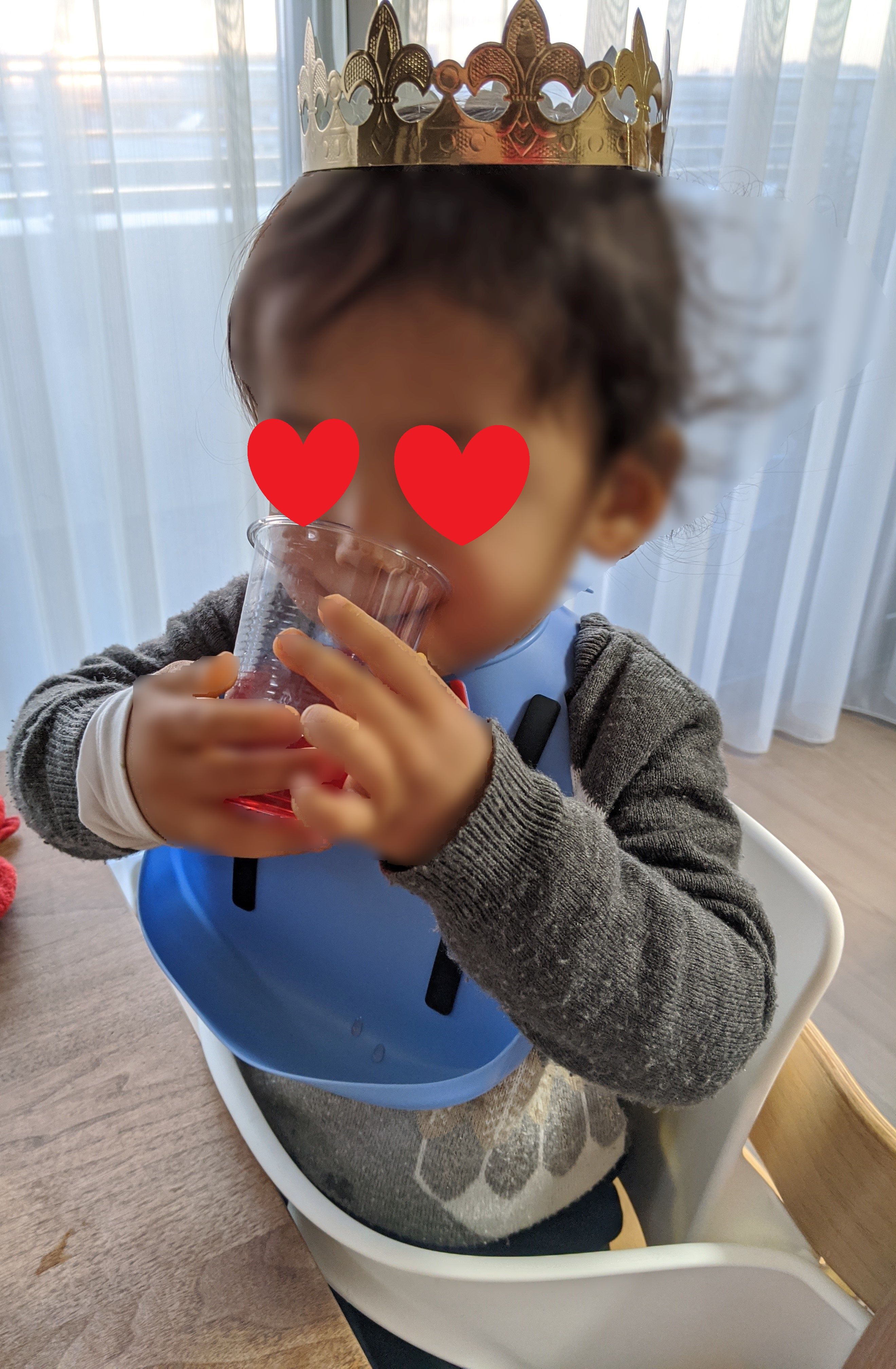 ↑ケーキはまだあげられないけど、お気に入りのハーブティでご満悦の息子。