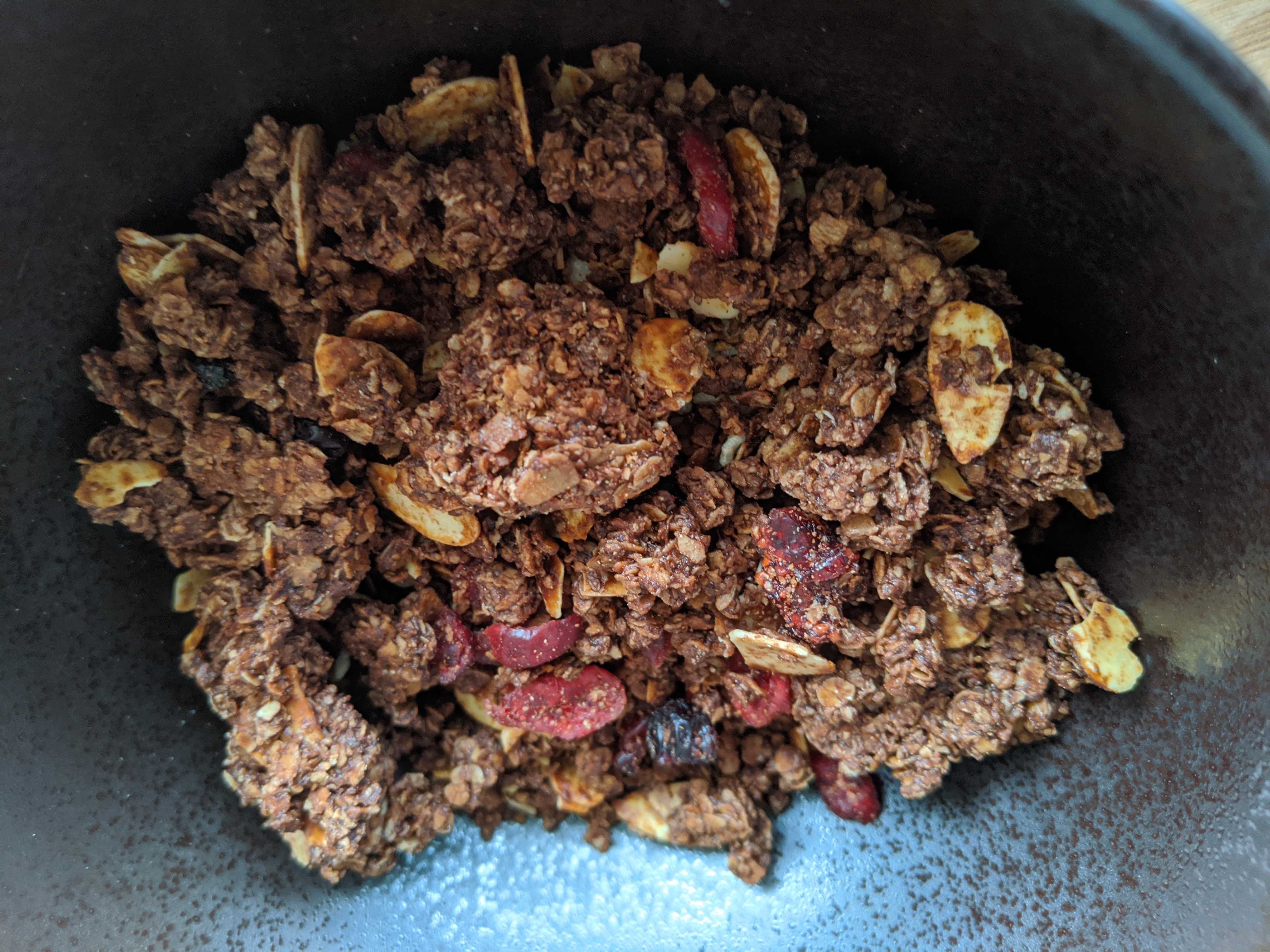 クランベリー、カシス、チェリー、ブルーベリーの4種のベリーが入ったココア味のグラノーラ。