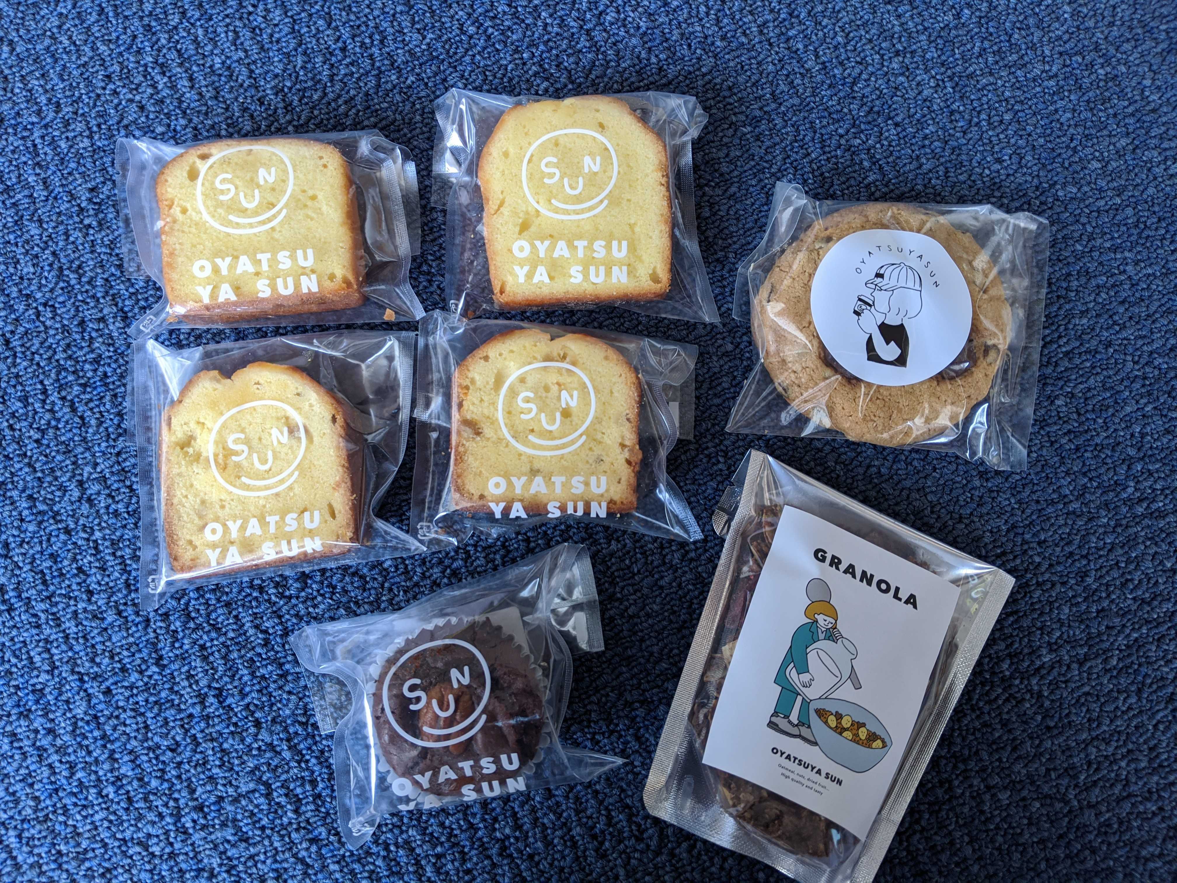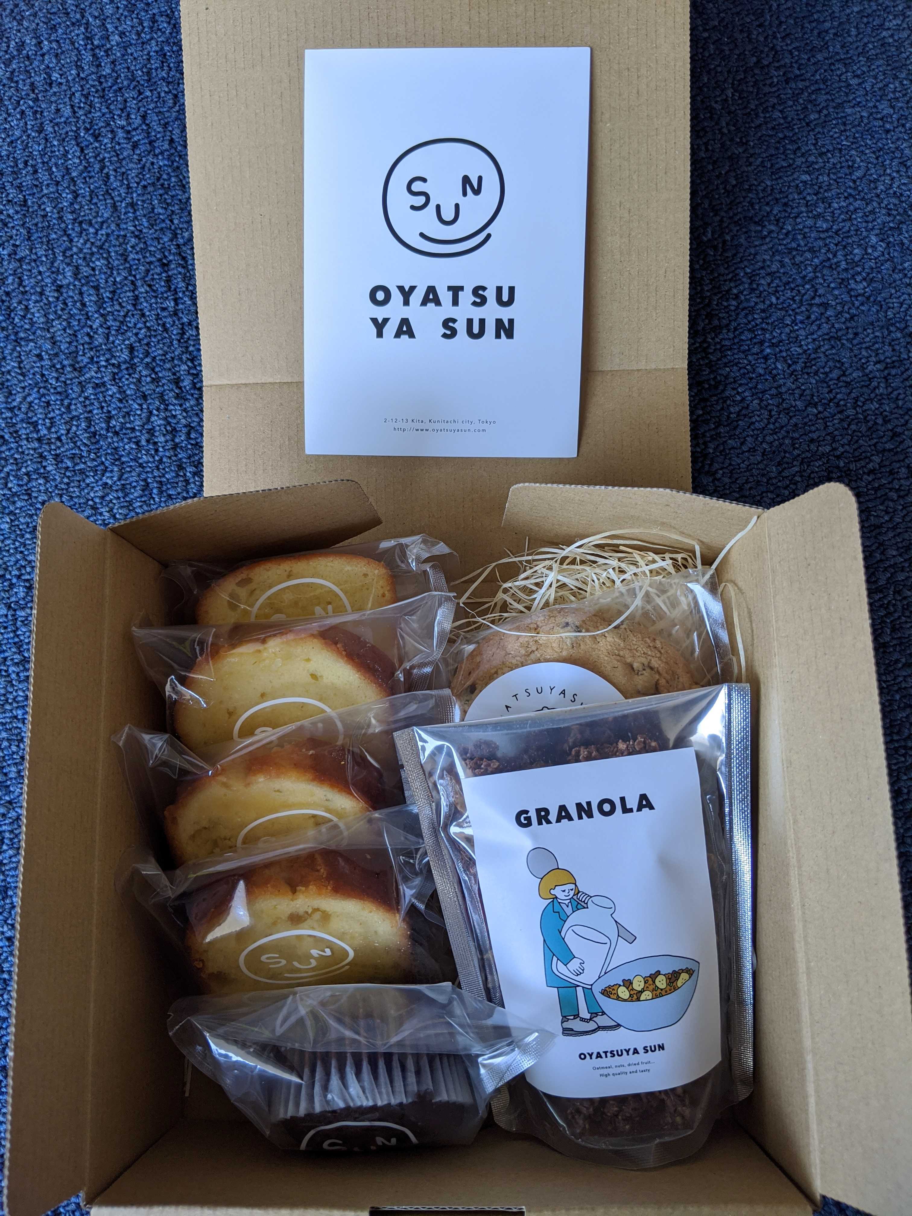 中身は、バニラのパウンドケーキ×2カット、はちみつレモンのパウンドケーキ×2カット、フォンダンショコラ、アメリカンチョコチップクッキー、4種のベリーのココアグラノーラ(100g)の7個。