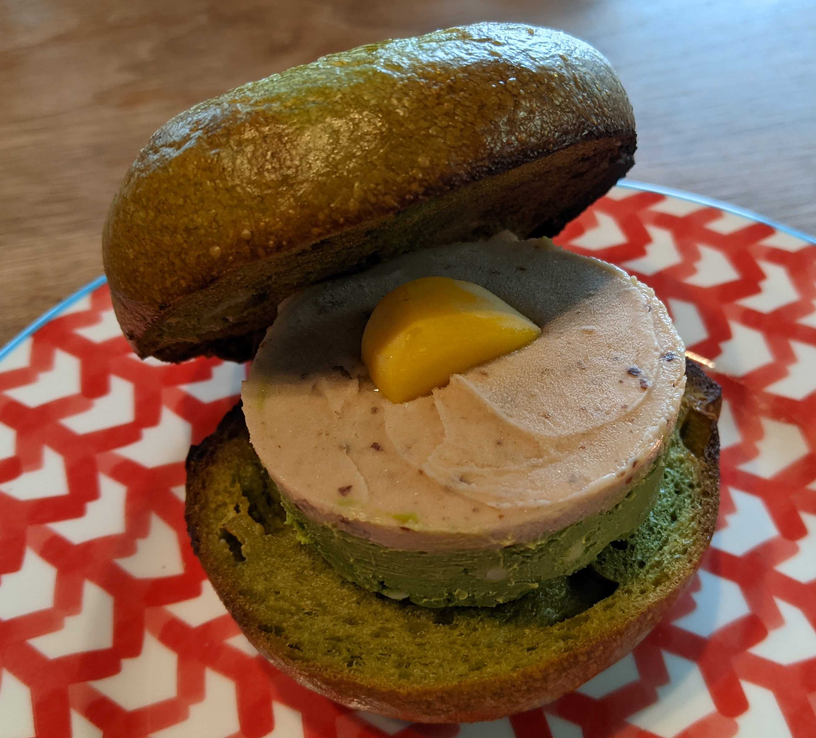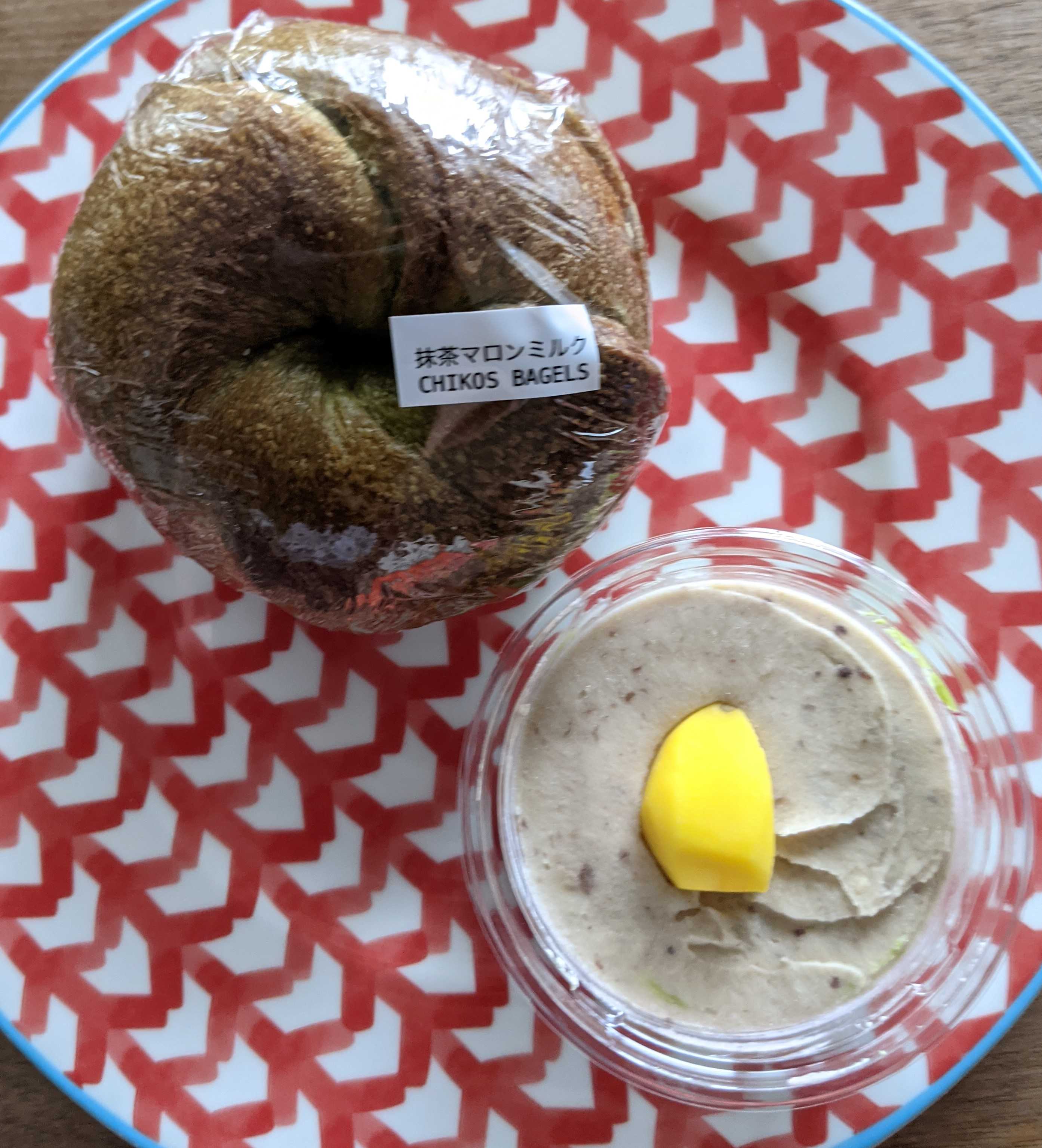 焼いているときから抹茶の良い香りがしたベーグル生地は、表面ガリっと中はむぎゅっとして抹茶の苦味がほんのり効いた美味しい生地。
