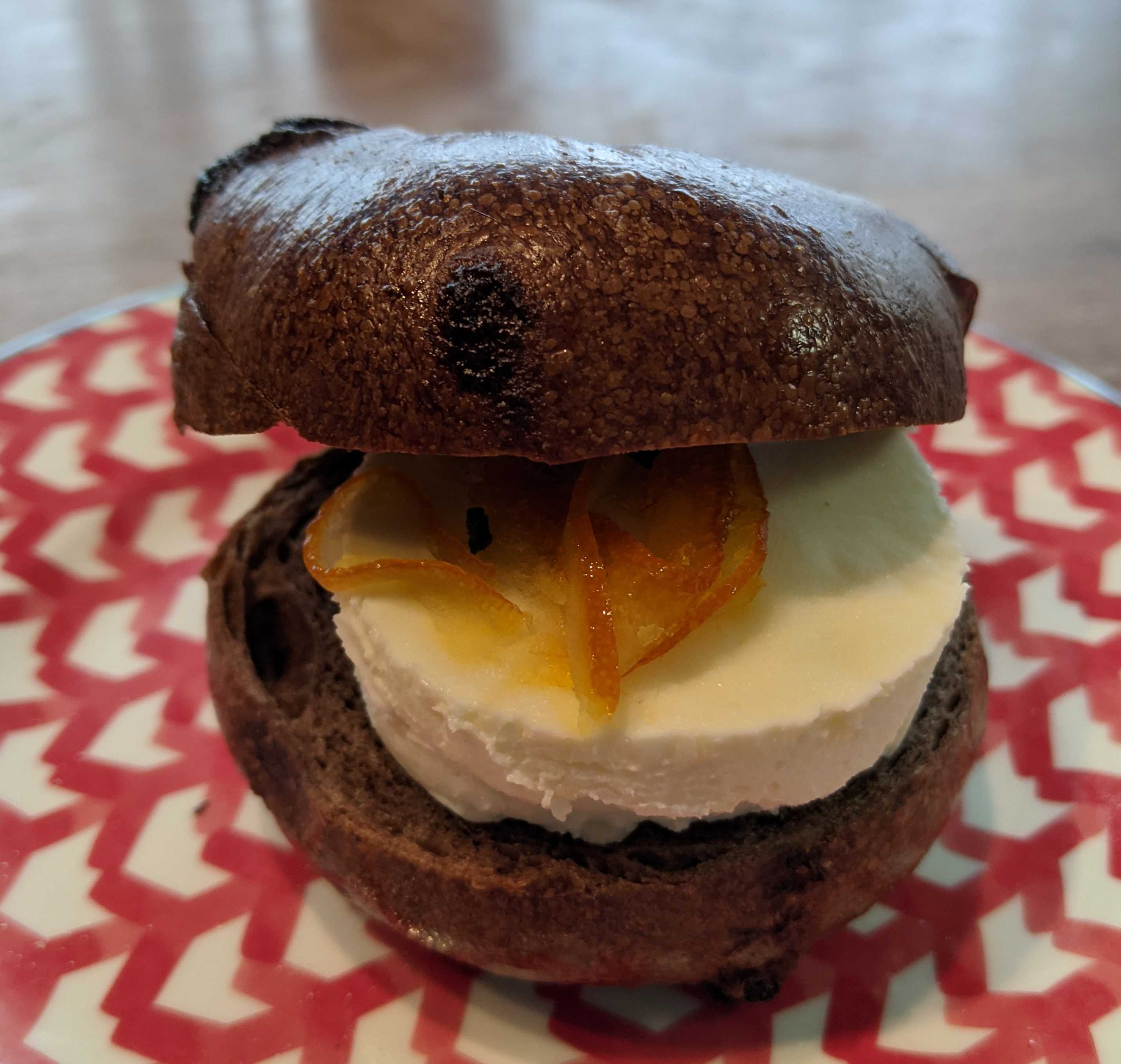 クリームはクリチベースでオレンジピールとピスタチオがトッピング、中にはコリコリ食感のホワイトチョコが入っていて、食感も味も香りも何をとっても美味し~