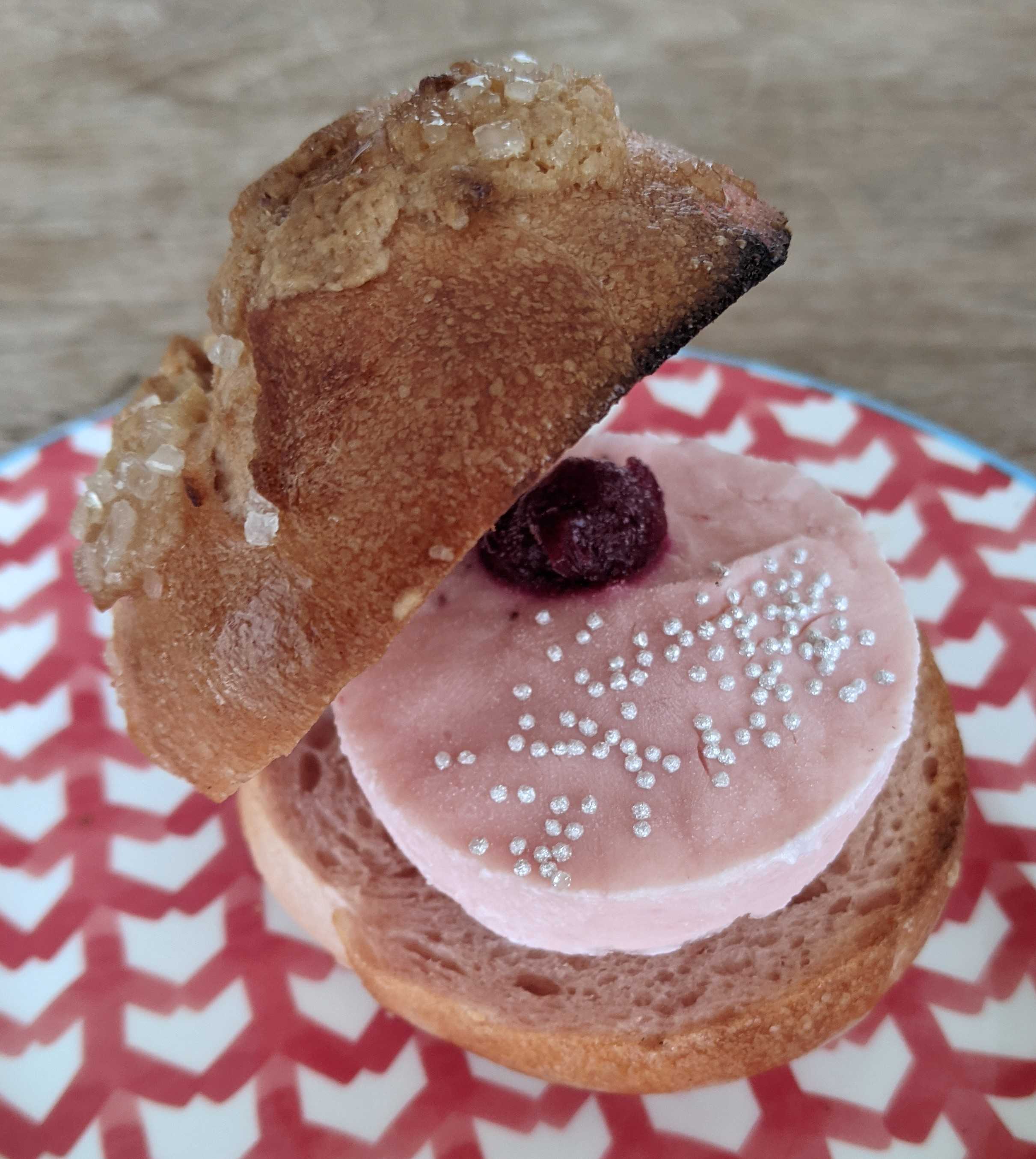 ピンク色の生地はトッピングのザラメとクッキー生地がガリッとサクッとしていて美味しくて、中はむぎゅっと。