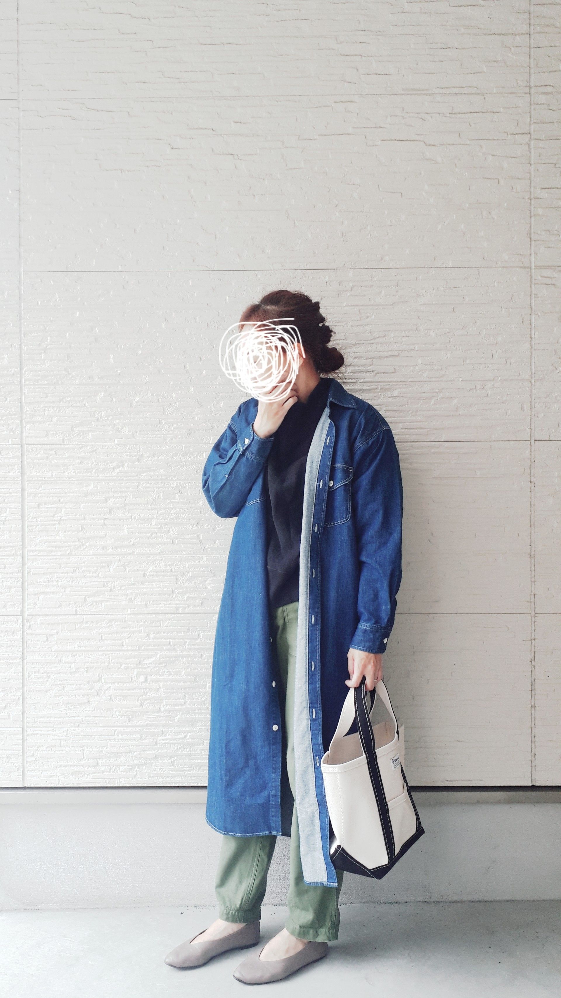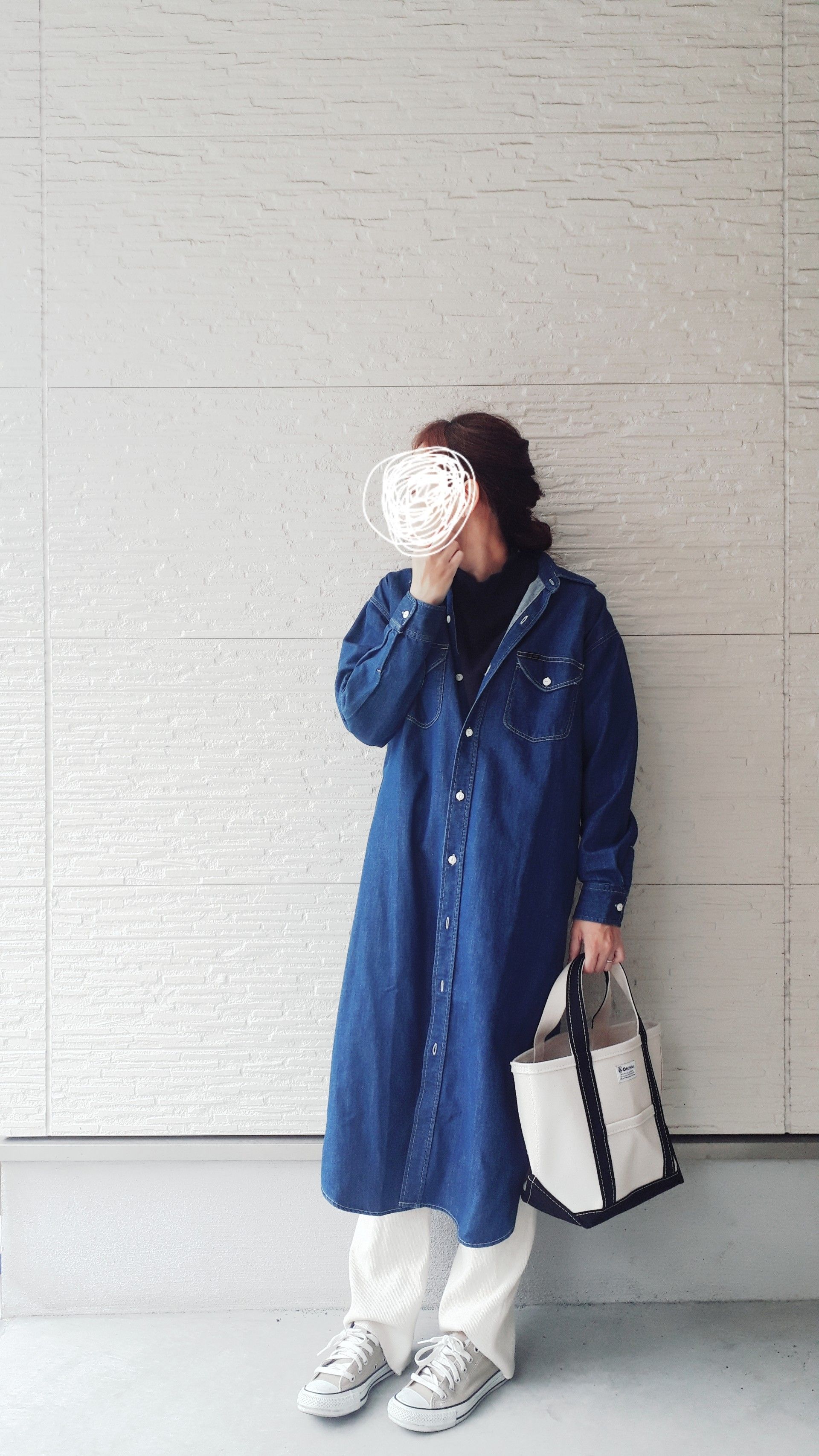 Leeのワンピースはサラッとはおっても可愛いですが、ボタンをとめてリブパンツに合わせても。