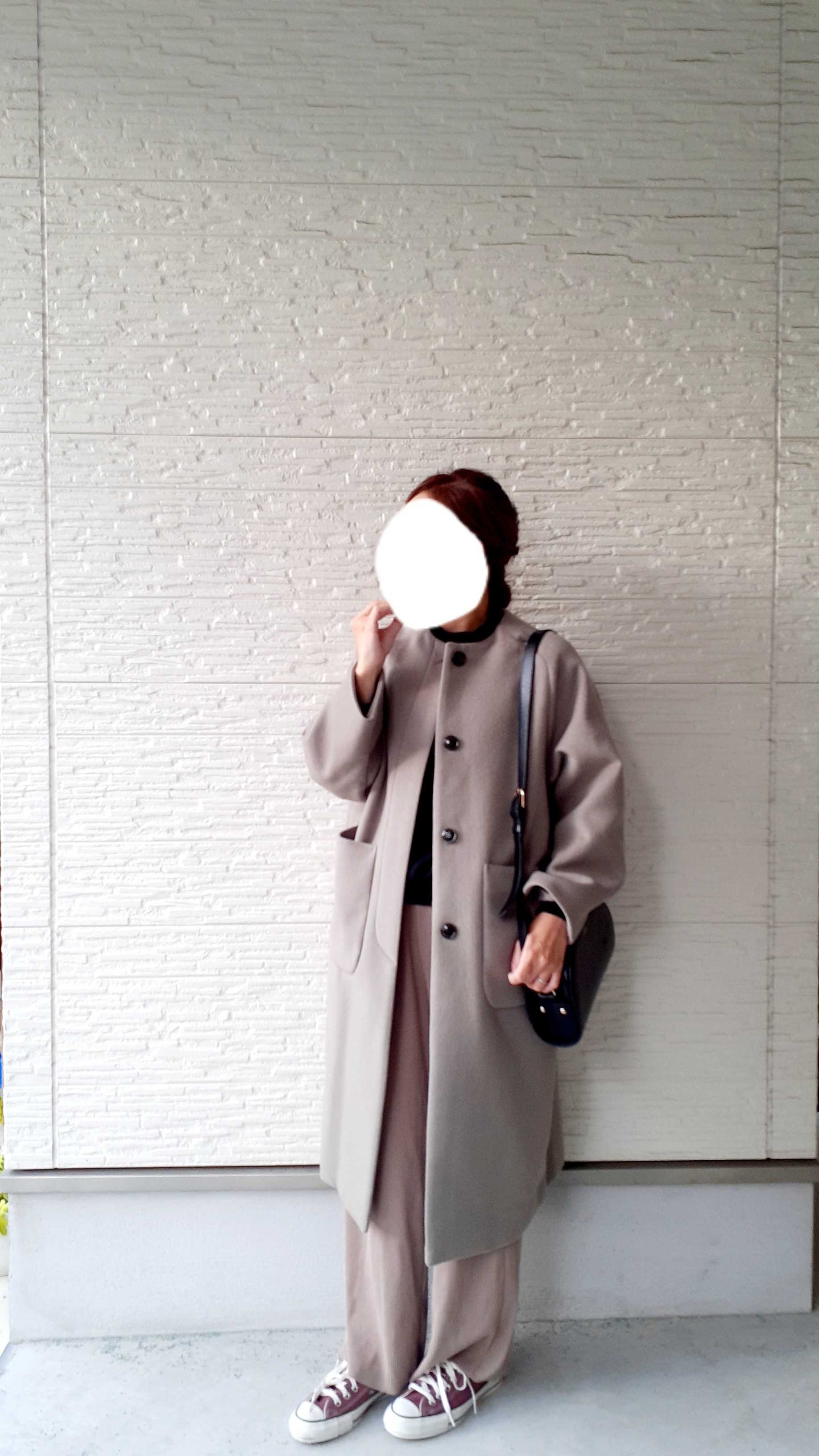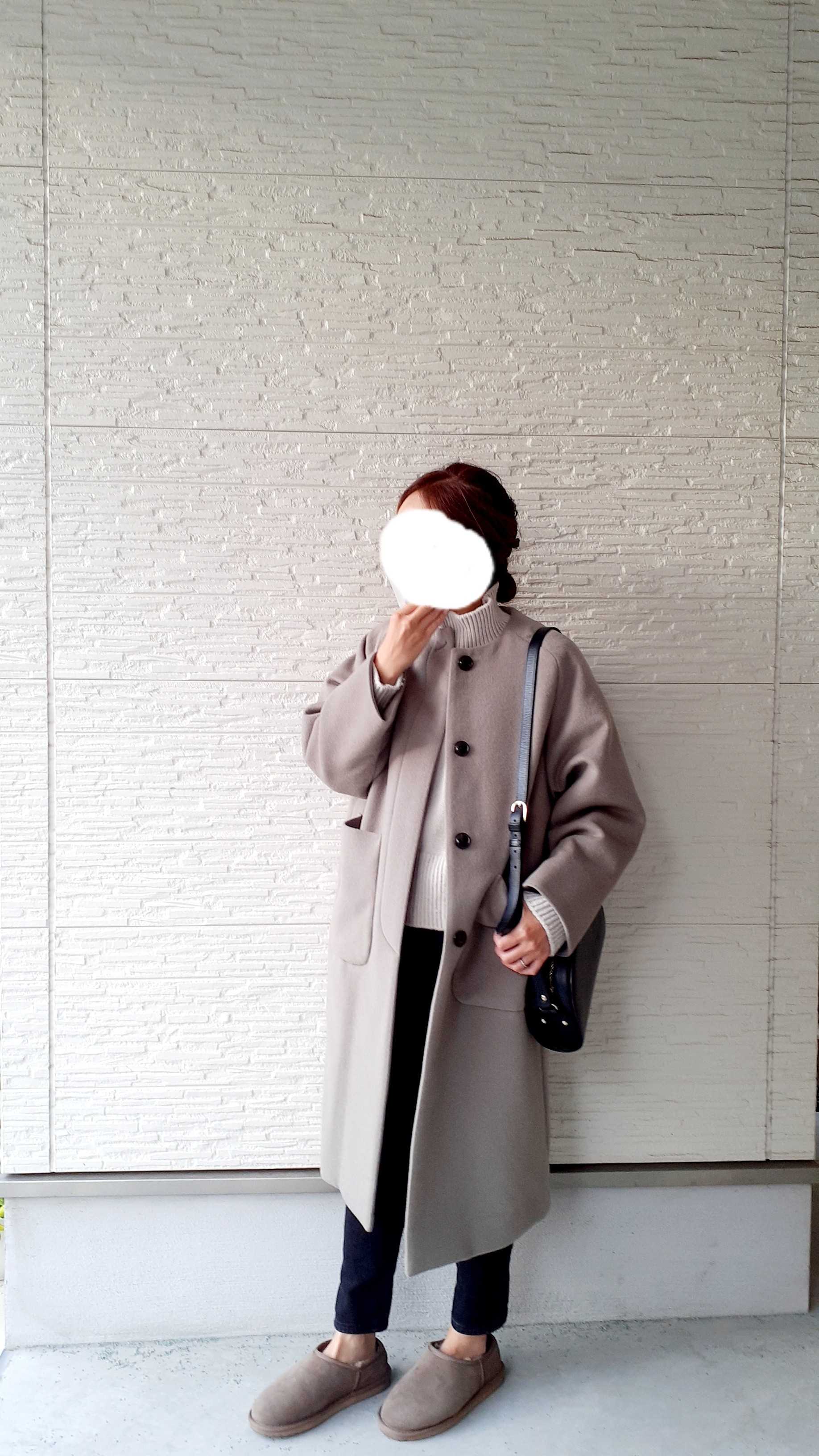 ノーカラーなので女性らしさもでて、きれいめにも大人カジュアルにも使えるコート。