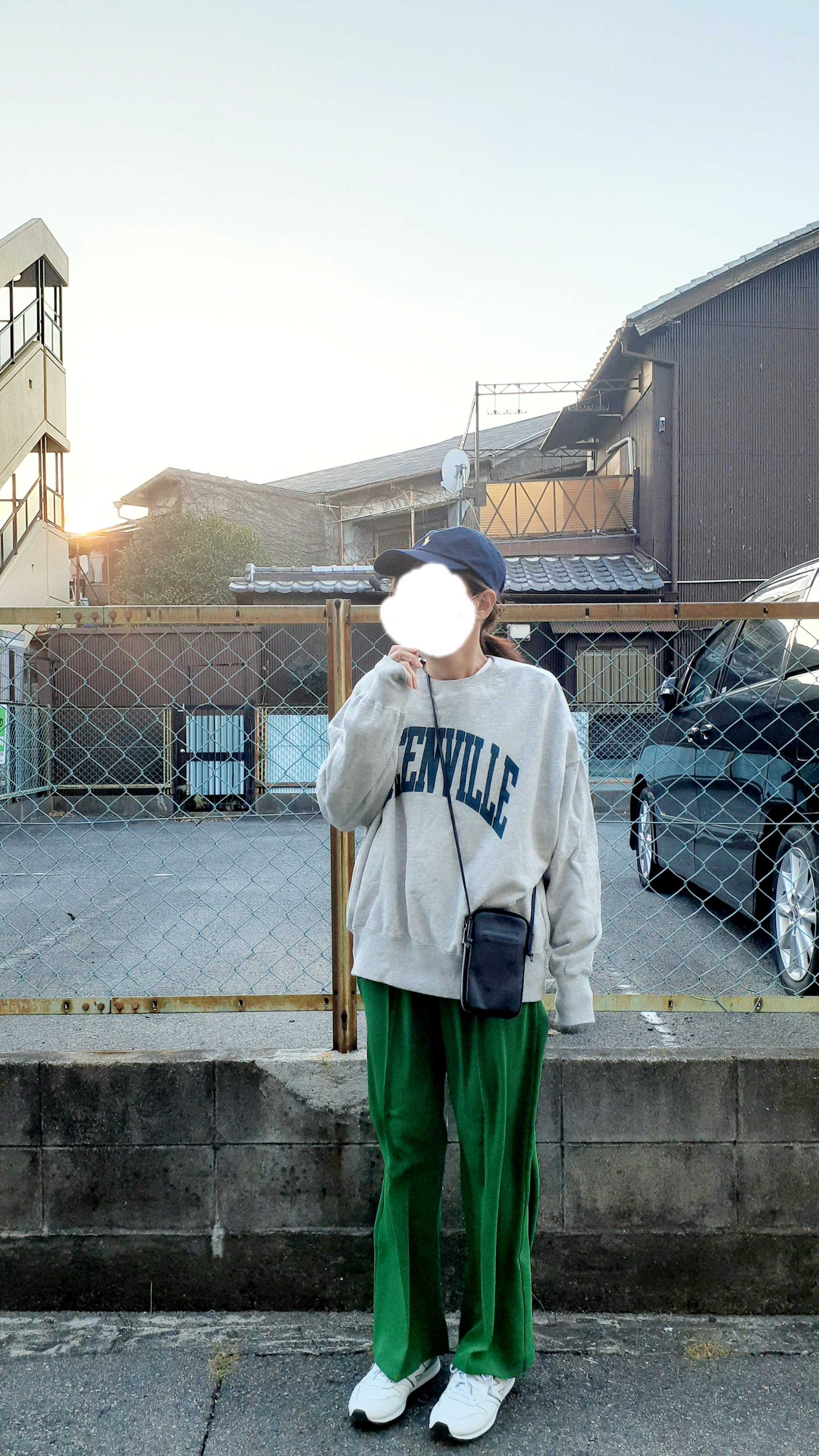 ポイントになってオシャレなグリーンパンツはレリューム。