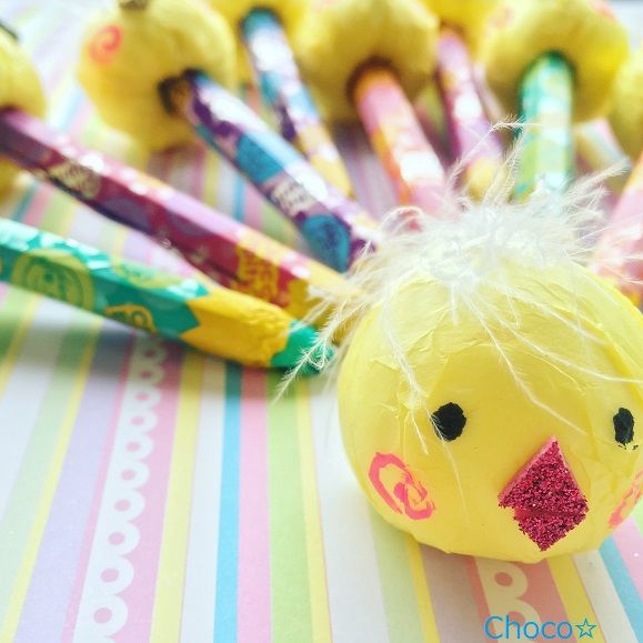 3.羽を両面テープで頭のてっぺんにつけて顔を描く。