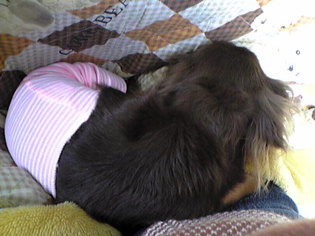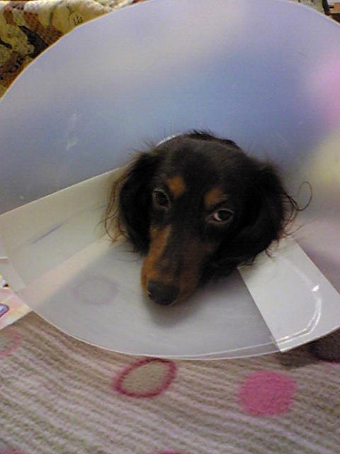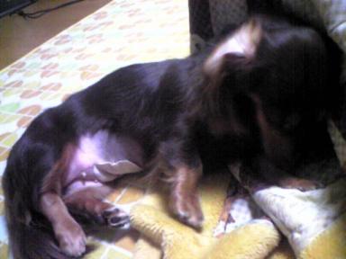こんばんわ~♪日中、携帯からのブログ更新を只今確認しましたが…画像が今は落ち着いてPCに向かう余裕が出てきましたチョコは無事に麻酔から目を覚まし帰還しましたよ~ 本日の報告 AM10:45 動物病院に到着 <血液&レントゲン検査> 血液検査の結果:数値は正常範囲 レントゲン検査の結果:特に異常なし体重:5.24kg (前回10月11日では4.78kg)太り具合が気になり体脂肪を測定してもらいました。29% [太りぎみ]肥満予備軍です。食事や生活スタイルを見直しましょう。 肥満犬への扉の中に入っていたようです Σ( ̄ロ ̄lll)そして…検査の結果を報告された後、手術の説明をされ承諾書にサインをしました。・避妊手術(卵巣子宮全摘出術)及び 歯垢歯石除去術サインをした後、控えを渡され後ろ髪を引かれながら先生にチョコを預けて帰宅しました。何かを察したのかチョコは私にべったりだったので胸が余計に痛みましたPM5:50 チョコのお迎えチョコはボーっとしていました。尻尾をフリフリもせずガクガクブルブル状態でしたカラーを装着していたので首が重そうだったのと耳の飾り毛が静電気と摩擦で毛玉になっていました。先生からは手術の経過を説明されました。手術中に心拍が低下した為に途中薬を入れたそうですダックスにはよく見られるような話もありました。歯石も綺麗にとられていて真っ白な歯になっていましたどうしても気になるのでチョコの摘出した子宮と卵巣を見せてもらいました。先生は丁寧に卵巣と子宮について説明してくれました。許可もいただき画像も撮らせてもらいました。ヒート中だということもあり卵巣が少し大きいとのことです。チョコのヒートの回数が多いこととヒートでない時でも♂を発情させてしまうことも小型犬にしては卵巣が大きいことが理由としても考えられるそうです。人間と違い子宮が2つに分かれていることに驚きました。冷蔵庫で保管してあったので硬くなり赤く変色していましたが摘出したばかりの時は綺麗なピンク色だったそうです。腫瘍も見当らなかったと聞かされホッとしました。無事に自宅に帰宅しましたがチョコはボーっとしています。鼻を鳴らすような声や低く唸るような声で何かを訴えてきます。言葉が話せたらいいのに…とこれまで以上に思います。カラーが邪魔でヨロヨロ部屋の中を歩いたりするのでトイレなのか?落ち着きのない様子なのでトイレに入れてみましたがしばらく固まったまま身動きが取れないチョコ。結局は何もしないままトイレから出てきてしまう…。何度か繰り返しながらテレビの前で伏せたかと思ったら粗相してしまいました傷口はテープが貼られている為、見る事は出来ませんでした。思った以上にお腹の毛を刈られてしまいました。傷口は5センチ程らしく抜糸は13日の予定だそうです。大人しくしているのでカラーを外してあげました。膝の上にアゴを乗せてウトウトしているチョコ。毛玉が凄かったのでコームでほぐしてあげました。夕飯は欲しがらないので無理に食べさせませんでした。昨日の午後は今日の手術に備え爪きりは傷口に触れても大丈夫のように丁寧にやすりをかけ足裏の毛も丁寧にバリカンをかけておきました。お散歩&シャンプーを済ませておきました。私自身、精神的に緊張で張り詰めていたように思います。とっても長い一日でした。今、隣のチョコの寝顔がとても愛しいです