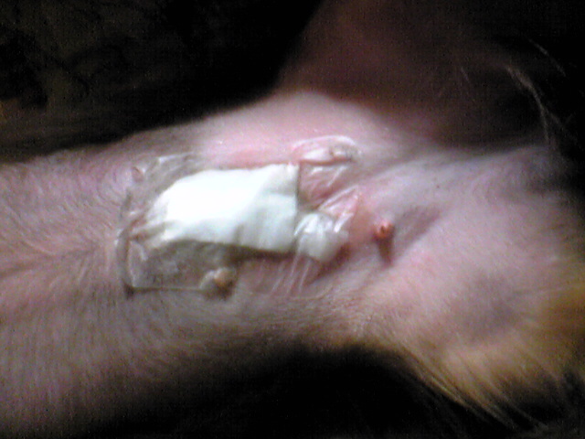 傷口とお腹を保護していた腹巻は何とも丁度良いサイズです私の膝の上でくつろいるチョコ今日もホットケーキを食しご機嫌に部屋を走り回っているときお腹の傷口に貼ってあったテープが剥がれ落ちていたようです※喜びの舞いに注意!!腹巻をそ~っと下げてみると傷口が露出していました舐め舐めしていた場所が化膿しているので病院で抗生物質を6日分もらっています。13日の抜糸まで順調に回復して欲しいです