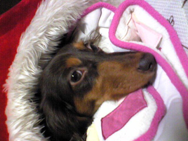 楽天に登録してブログ開始したのが昨年の元旦ですがあっという間の一年でした。今年もどうぞ宜しくお願い致しますチョコは昨日の夕方に不信な物音に反応して吠えました手術後から初めて吠えたのです。お腹の傷が痛まなくなったのでしょうか。カラーを外したので傷口を舐めないように気にかけて常に側にいたので甘えてきていたのですが鼻を鳴らしたり唸り声もなくなりました。ドライフードも少量ですが食べるようになりました。病院で体脂肪測定をした時にもらったサンプルフードをいつものフードに混ぜてみたらサンプルばかり食べています。肥満防止に注文してみようかしら昨日の夜、飲ませ忘れてしまいましたそうそう、昨日の大晦日未明から産気づいた妹ですが昨日の昼過ぎに無事に女の子を出産しました。帝王切開にならないで良かったですよ~