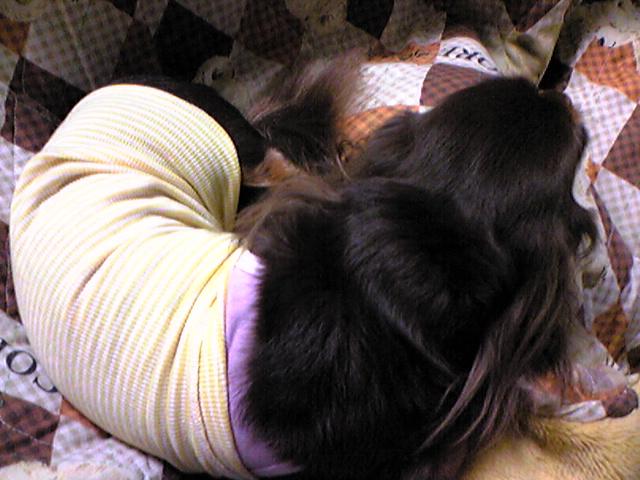 寝不足気味です。ウトウト寝ているチョコに添い寝したのですが何度も唸り声で起こされました痛みがあるからなのか?水分補給も嫌がるし…ご飯も食べません前足のテープを剥がしてあげたらペロペロしてばかり。お腹のテープは舐めないので良かったです。カラー装着のストレスは与えたくないですから朝3時頃に妹から携帯に連絡が入りました。臨月だったのですが破水して陣痛が10分間隔になったのでこれから病院へ向かうとのことです。卵巣子宮摘出術をしたチョコは母になることはないのですそう思うと複雑な心境になりました。先ほど妹からのメールによると未だに陣痛と格闘しているそうです。子宮口も開かないのと破水してから時間も経過しているので帝王切開の可能性も出てきたそうです。なるべくはお腹を切らずに赤ちゃんとご対面して欲しいですよ。チョコが気掛かりで今すぐ病院へ迎えない。うちから車で5分程の近所の病院なのに…。妹よりもチョコの方が大事なのでしょう。妹よ、薄情な姉を許して下さいよーく考えたら優しい旦那が付き添っているのだから姉が側にいなくても平気でしょう。。。チョコはアタシが居ないと不安になるのだから安産を祈るばかりです