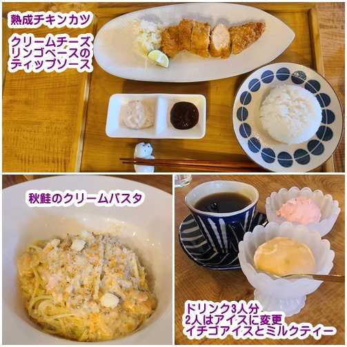 母は月見ハンバーグ、私はチキンカツ、姉は秋鮭パスタ