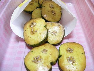 パンが減らないから昨日はクッキーを作ってました。お芋クッキーが好評だったから、カボチャでも焼けるかなって。カボチャを煮るときに、4個別茹でしてペーストにしておいてクッキー生地に入れて丸めて延ばして筒状にして回りに富澤商店でやっと買った抹茶をまぶして冷凍しておきます。輪切りに切って卵白塗って、白ごまを種に見立ててペタペタ。カボチャに見えるかなぁ~?ちょっと無理があるかなぁ?冷凍が長かったから抹茶も色が濃いのかな?前に焼いて紹介しないでいたクッキーは黄緑です。これも以前から焼きたくって、ピーカンナッツが手に入ったのでやっと念願かなって焼けました。カシュカシュさんのレシピです。焼く前は白い生地に茶色いナッツがいっぱい見えたけど焼いたら綺麗な茶色になってビックリしたの。サブレみたい。香ばしくってとっても美味しかったの。これは保存版だわ。パンは焼かないって言ったじゃないと思ったでしょう。ちゃうのよ。カシュカシュさんのレシピを見に行ったときに見つけたクッキーです。 メロンクッキー*。○ by かなやん左上のはチェルシーなんです。大きさが分かるでしょ。メロンクッキーです。でもメロンエッセンスが無かったの。バニラとレモンしかないので、レモンオイル入れちゃった。だから正確には、レモンクッキーなんですよ(*'-'*)エヘヘ全部で30個以上出来るレシピだったから半量で作ったの。一度に沢山作っても我が家は手作りお菓子食べないからね。誰かにあげられるときしか作れないお菓子やパン。今日はマコmamaちゃんに強引に貰ってもらいました。(⌒▽⌒)アハハ!押しつけに行ってきたのだぁ!