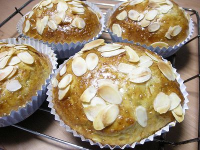 フープロで生地を捏ねるのが1分。フィリング入れたら粉々30秒(笑)これを利用して、煮リンゴを生地に練りこんだパンを焼きました。リンゴは小さく切って蜂蜜・シナモン・レモン汁でしんなり煮て。仕込み水は濃い目の紅茶。小さく切ったバターをいれてガー!!卵も照り卵を残し全部入れたので生地が少し緩くなっちゃった。カップに入れてベンチ有りの丸め無しで本当にテキトーです。照り卵をして、表面がデコボコしてたので隠すようにアーモンドスライスを乗せて170℃15分の焼成です。リンゴの粒が米粒ほどに。でもほとんど見えません。紅茶の風味もシナモンの香りもちゃんとしました。食感は、ちょっと水分が多かったのでモッチリです。蒸しパンを食べてるような感じもします。これはアリだな。柔らかく弾力のある朝食向けのフルーツパンになりました。