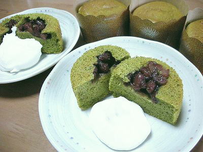 今日のおやつにチョット変わったことがしたくて作りました。先日作った抹茶シフォンが美味しかったので、そのレシピでマフィンカップを使って餡を入れて焼いたカップケーキです。半分に切ったけど失敗してるの分かる?(〃⌒ー⌒〃)ゞエヘヘ。本当は餡が真ん中に残って欲しかったの。だから生地をカップに注いで、焼く寸前に缶詰の餡をスプンでポテッと乗せたの。沈むのを前提で乗せただけなんだけど、焼き初めて5分で餡が全部見えなくなったの。真ん中にあるかなって思ったら一番下まで沈んでたぁ。カップ剥がしたら底抜けでした(笑)おやつに食べる分はクリームを添えて食べたけど会社のおやつに持っていく分はこの状態に出来ないので、シューの口金で中にたっぷりクリームを絞り込みました。食べてみたら中からクリームがボテっとあって美味しい♪餡が底抜けでも、カップに入ってるから気にしなぁい。笑って食べちゃえ!!!(* ̄m ̄)ノ彡_☆ばんばん!