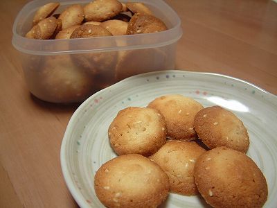 年内は材料を買わないであるものだけでパンやお菓子を作ります。さて、今度の食材処分品は?と引き出しに、ぶぶあられ発見!前に、和菓子だっけ?何かについていて使わず取っておいたの。ぶぶあられは、某メーカーの鮭茶漬けに入ってる真ん丸のあられ。商品としてはフライの衣にしたり、きっと見た事あると思います。バターとショートニングを同量練り込んで、お砂糖と卵白と混ぜて薄力粉・ぶぶあられ・白胡麻を入れて作る絞り出しクッキーです。これはパン教室のお楽しみメニューで習ったの。卵白1個分で鉄板3枚分のクッキーが出来るの。和風ラングドシャみたいね。あられが小さかったから、おかきクッキーとは言いにくいね。ぶぶあられなんだから、あられクッキーでいいのに( ̄m ̄〃)お茶漬けや揚げ衣に最適です1106PUP10ぶぶあられ(* ̄  ̄)b<言わないと胡麻クッキーって思われちゃうのよ。レモンオイルも入ってるのでスッキリした感じもあるんです。サクサク香ばしいクッキーで美味しいですよ。v(*'-^*)v♪