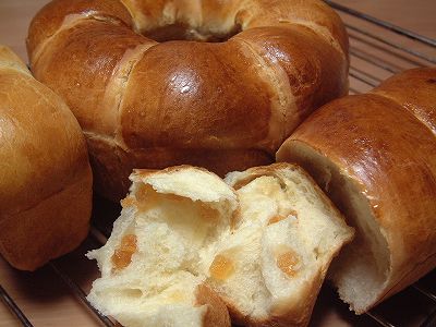 大納言ブレッドを作ろうと思ったんだけど、色々迷ってしまって結局、失敗しちゃったよ。いつも教室のメッシュのレシピでは型にいっぱい膨らまないし、あんこを練り込むから膨らみが悪いと自分勝手に思いこんで、生地を多目にしたの。それが間違いなのよね。これまた在庫処分の最後の耐糖性のイーストを使ったら一次発酵でかなり膨らんだの。小さくちぎって大納言を包んで並べる成形だけどここに大納言を入れたらポンポンになっちゃうと思って止めたの。バカねぇ。生地を少し取って丸パン作っておけば良かったのよね~。メッシュの穴から生地が苦しそうに出てきたけど無理に開けようとん~~!(></)/§ビシッ!と割れたぁ!熱気と一緒にメリメリッと。先に爪楊枝で穴をプツプツさして外せばよかったのに力まかせで開けちゃったのよね。( ̄○ ̄)ア( ̄о ̄)ホ!粒あんも捏ねちゃってるから漉し餡みたいに粒が無いしぃ。その日の夕飯に旦那ちゃんにトーストしてマーガリン塗って食べて貰いました。アタシσ(o^_^o)はご飯食べた後だったんでまだなの。餡とマーガリンは合うから美味しいでしょうね。ただ、割れ方が半端じゃなく、縦に1本入ってるから悲しいよ。割れた方を下にして撮ってるから綺麗に見えるけど真っ二つよ。ドヨォン(≡д≡)。早いトコ食べちゃわんと気分が悪いわぁ。