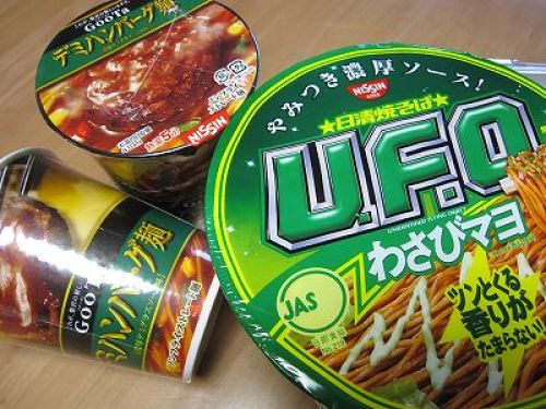 お買い物に行ったら目に付いた緑のカップ麺。太麺に濃厚ソースの焼きそば、わさびマヨのUFO!とラーメンのデミハンバーグ麺!検索したら、UFOは2011年に出たリニューアルで今日新発売だって。日清GooTa デミハンバーグ麺も今日、同時発売って書いてあるよ。ラーメンにハンバーグを入れたら味も具も溶けてっちゃわない?どっちかを明日のお弁当にしよう。サラダだけ持って行こう。GW最後の日に卵の賞味期限が切れて慌てて作ったお菓子です。上のは黄桃のヨーグルトケーキと新しいレシピのミルクシフォン。下のスフレチーズケーキは久しぶりに焼いたんだけど、湯煎焼きで70分!作り慣れてないから焼成時間にビックリです。1時間10分!!パンって小さければ10分で焼けるのにケーキって時間がかかるね。パンの写真が無いけど、主食なので焼いてます。米粉玄米パン、チョコチップとドライメロンの丸パンや、黒糖・胡桃・レーズンパン。珈琲ゼリーも。アガーの在庫消費に冷菓はどんどん作るよ~♪