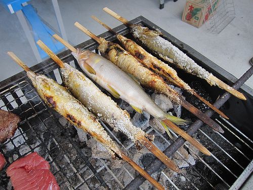 鮎を頂いてるんだけど、なかなか焼く機会がなくて凍ったまま。せっかくだから炭火で焼きたいね~と言ってるだけでノビノビ。ついでにBBQもやろうと思ってたので猛暑が続いては機会も逃し今日ならと思ってたら台風が接近してる。また来週かと思ったら雨が降るのも夜からみたいなんで、恒例の車庫でBBQしました。お肉は2kg、野菜はチョコット。鮎は12匹を順番に焼いてまぁす。焼けたところに次の鮎を乗せてパチリ! あ~~塩忘れてる~!慌てて塩をすり込んだけど表面が焼けて、コイツだけ半分薄味(笑)焼き立て鮎は香ばしくて、皮も薄くパリッパリと美味しいね~。最近の美味しいお気に入り果実。デザートに山梨産ゴルビーです。大きくて種なしは嬉しい。あんまりお店には出回らない葡萄です。これ、大きくて甘くて美味しいんだぁ♪奥に500円玉置きました。粒が大きいとみんなで食べると1度に無くなるのがチト淋しいね。