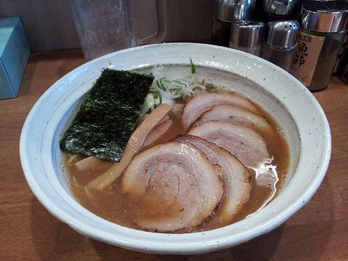 今日はラーメンが食べたいと言うメタボちゃんにお付き合い。どこに行こうか迷って、可児市の初めてのお店にしました。メタボちゃんの食べたチャーシュー麺950円で細麺です。普通、湯気が出て撮りにくいけど・・・熱々じゃない?私は初めてのつけ麺です。魚の出汁が濃厚の上に魚粉乗せだね。スープはラーメンの汁ってより、お雑煮を思いだしちゃったよ。麺は太麺で冷たいのと、汁の丼も冷たい。最初暖かかったけど、すぐに汁も冷めて、つけ麺ってラーメンのザルソバなのかな?魚粉の濃厚なスープはとっても美味しかったけど、麺通じゃないので正確な批評は出来ません。検索したら他のお店は熱い所もあるんだね。ラーメンもぬるかったらしいから、丼を温めてくれるといいのにね。私は、ラーメンって麺から食べて最後まで麺なので苦手なのかなぁ?最初にサラダやスープを頂いてメインとパン。最後に珈琲デザートがいいな(笑)じゃ、ラーメン食べに行くなってか?嫌いでもないし今日はお付き合いだもん。メタボちゃんと行きたい所が違うので、やっぱランチは友達と行きたいんだよ。お店は満席で1組帰ると1組入ってるって感じだから人気店みたいですね。ちょっと狭いけど、お店の人も若い人達で元気で雰囲気は良かったですよ。