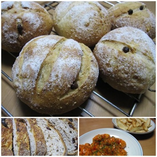 チョコオレンジグラハムプチパンを作るつもりがバターを入れ忘れ!気持ちはふんわり丸パンだったけど、塩を入れ忘れてはいないので助かったぁ!水・塩・イーストのの入れ忘れは致命的だけど、砂糖油脂はなんとかなるので、しゃーないハードパンと思う事にしよう。ソフトフランスと思い込んで(笑)二次発酵が終わったら、全体に強力粉を振ってクープを入れて、チョコオレンジグラハムブール?ちょっとモッチリ?ムッチリ?してるけど、横に半分にカットしてトーストして頂きます。チョコいっぱいで甘さで誤魔化せるんだ(笑)下のは、その前に焼いた、クランベリーと胡桃のバケット風のパン。グラハム粉40%くらい入ってるのでキメも荒いですが香ばしいです。下の右側は最近頑張ってる、ガスオーブンでオイルフリーの料理。と言っても、まだ生のエビからは不安なので、揚げるフリッター。ちょっとだけオイルスプレーを吹きかけて200℃で10分焼いたよ。オーロラソースで和えるつもりが、ケチャップが多すぎて赤い(笑)エビの水分が抜けすぎたのが残念。でも美味しく頂きましたよ。皮付きポテトは少しガーリックオイルスプレーをして焼きました。ポテトは揚げたようなカリッカリ感は少ないけどホクホクでしたよ。これからは、カロリーが多くなるポテトフライはポテトローストに。