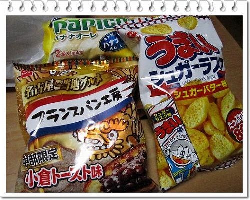 限定品や新しモン好きの私。最近見つけたお菓子の一部。あくまでも一部(笑)ミスタードーナッツもポン・デ・うまいもん、として東日本・西日本と限定で12月4日より始ってます。私の住む西日本は、東海の小倉トースト、中国地方のマスカット、関西のお好み焼、九州のマンゴ、の4種類。あとは検索して見てね。話がそれたので戻します。中部地方として小倉トースト味のフランスパン工房。うまい棒の大袋があって、シュガーバターラスク。美味しいけど甘過ぎる~。パピコのバナナオーレは初めて見たので衝動買い。まだ食べてません。パピコって美味しいんだけど、小さいからすぐ無くなっちゃうのよね。他にも季節限定とか、見つけたら嬉しくなって買っちゃいます。あれこれとお菓子を買ってるけど、チョコシフォンも焼いたよ。写真は無いけど、頂いたレシピに卵黄3個、卵白7個って書いてあってうっそぉ~!と思いつつ挑戦してみたかったけど、膨らみすぎない?心配で卵黄3個、卵白5個で作ってみました。泡を消してしまうと言うココア味にして挑戦。良く膨らみました。でも膨らみすぎでは無いです。食感がクシュクシュとした感じで柔らかいです。そっか、そう言う事か。卵白で膨らみすぎる事は無く、弾力が無くてシットリするレシピなのね。しっかし!3個7個のレシピは、卵黄4個どうすんだ!って事で作りません。卵の節約で、3個3個もやってたけど、やっぱりシットリさは少なくなるね。卵白だけのホワイトシフォンはネチャっとした感じで好きじゃ無いです。でも、卵白の意味を知る良い経験したよ。ココアシフォン美味しかった。