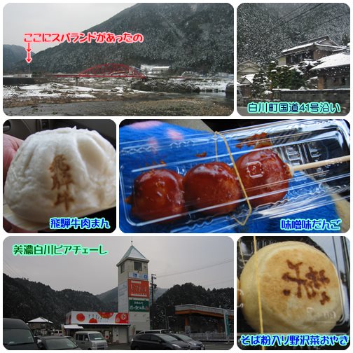 お正月休みも今日で終わりだったので、どっこも行ってないので近場にドライブ行こうかと、久しぶりに七宗町・白川町の道の駅へ。家庭用の白川茶が欲しかったし、道の駅なら何かあるかなぁ~って。R41を北上します。車で30分走るだけで路肩に雪が沢山残ってます。七宗御殿では、飛騨牛肉まん、そば野沢菜おやきを買ったけど・・・う~ん??味が薄く素材の味も??あんまり美味しく無かったです。お団子は巨大みたらし団子に味噌だれタップリで美味しかったです。白川まで行けば温泉もあるので足湯だけでも~って言ったのに却下。子供が小さいときに、端の向こうに滑り台のある温泉プールがあり子供も出来るゴルフみたいのがあったのに、無くなっちゃってた。どっこも行かないよりいいっか、と寒い寒いと帰って来ました。さて、明日からお仕事が始ります。お休み終わっちゃったぁ~。