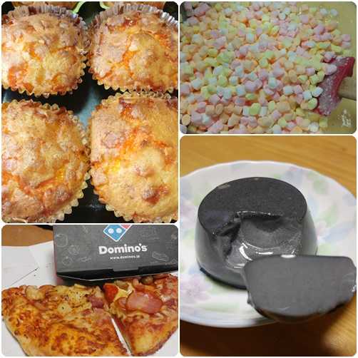 岐阜県も緊急事態宣言が出ました。県民の人数で割ると、かなりの割合です。不要不急のお出かけは控えるって事だけど、テイクアウトならとドミノピザ。ネットでセットメニューを選んで、ピザを3種類、サイドメニュー3種類選んでポチ♪ポチ♪作って~とボタンをポチッと購入。お支払いは楽天ペイで完了!そのまま、マスクして取りに行って、焼きたてを貰って速攻家に帰りで頂きます。おやつは昨日作った黒胡麻プリン。お家で何もしないで食べてTV見てグータラ♪そういえば、先日ダイソーで見つけた小さなマシュマロがあるの。計量もしないでマフィン生地にダー!と入れて作ってみました。マフィンカップも使わず、おかず用のアルミで作ったからダレてるよ。表面に出たマシュマロはカリカリ。中のはふんわりしてわかんないの。バターは使わず太白ごま油だけど弾力のあるマフィンって感じかな?カラーマシュマロの意味はなかった(笑) でも美味しいですよ。