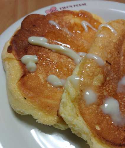 スフレパンケーキを食べたいけど、ステイホームで自分で焼いてみたよ。シフォンケーキのような作り方だけど小麦粉と水分が少な目なのね。ふわっふわの生地をフライパンで2回に分けて小さめ10個焼いたよ。最初のケーキは高さも出ていい感じで、ジジババちゃんと旦那に。2回目は生地がしぼんじゃって高さが出なかった。追い生地してもダラ~としてきたからホイップしてすぐに作らないとダメなのかな?写真は最後の私の分のパンケーキです。厚さが無いけどクシュふわはちゃんとあって美味しかった。何枚でも食べれそうな軽い食感だよ。 上には、バターと蜂蜜のポキッと折ってかけるやつをかけてます。蜂蜜が甘すぎたぁ。ホイップもあったけどトッピング忘れて完食!