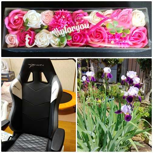 母の日に次男夫婦がバラソープをプレゼントしてくれました。石鹸と薄いバラの香りがするのでパソコンの上に飾りました。長男からは、たまたま母の日にってだけなんだけど、自分の部屋用に椅子を買ったので、前の椅子が邪魔なのでくれた(笑)でも3万もするんだよ。オットマンが付いた良い椅子なんですよ。こだわりがあって買った椅子なので。独身男は無駄遣いが多い。おかけで、要らなくなったものがいつも貰えて買わなくて済むわ。庭のアヤメが満開になっていて義父が写真撮っといてと言うので。シャクヤクはまだ真ん丸の固い蕾です。500円玉くらいかな?咲くと20cmくらいになるのに蕾は可愛い小手毬みたいですよ。帰りにコンビニに寄って見つけた「パイの実みたいなデニッシュ」パッケージに惹かれただけで即購入。八角形になったデニッシュ。パイの実が大きくなったみたいだ。遊び心の商品、増えたね~♪