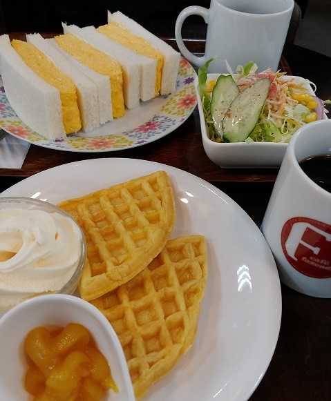 GWは何処も行かないつもりだったけど、旦那ちゃんがバイクのオイル交換に。すぐは出来ないでしょうから、バイクを預けて2時間くらいお茶して来ようと。4月にOPENした新しいカフェ。行ってみたけど駐車場混んでて横の店舗でBBQしていて、人もマスクなしで駐車場を歩いてる。1台空いていたけど集会のBBQって怖いのでUターン!買物がてらにヨシズヤへ行きました。時間が午後なので空いてるだろうと、パティオの中のカフェファゼンダへ。ちょうど、地方紙のかにさんくらぶに、たまごサンド特集を見ていたので珈琲とサラダのセットとワッフルのミニかな?珈琲のセットを頂きました。これで、1300円でおつりが来たよ。卵焼きは注文してから焼くので熱々ふわっふわ。ワッフルにアイスと選べるソースが付いていてお値打ちです。GWの始めの方で義父を病院に連れて行って、待ち時間に近くのビックボーンでモーニングして待っていました。ずいぶん前からあるお店でレトロ感があります。モーニングにプラスにして豪華に美味しく頂きました。
