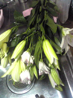 今日は横浜で研修でした。 ぐったり疲れきっての帰り道、家の近所に新しい不動産屋さんがオープンしていました。 とはいっても20時過ぎなので、本日はもう閉店していましたが。 店の前には大量の花輪。 ぼ~っと通り過ぎようとしたら、店のシャッターに貼紙が!! 「生花 ご自由にお持ちください」 えっ、お花もらっていいの?? 前にテレビでどっかの地方は花輪から花を取っていいというか取るもんで、いつまでも残っている方がみっともないというようなのを見たけど、こっちではこういうの初めて見た~~。 わー、お花もらおう。 白ピンクのゆり欲しい~~。 ぐい…。 ぐい…。 ぐい…。 か、固い。 道路の向こう側にいる人が私を見ている!! 違うのよ!! 持っていっていいって書いてあるのよーー!! ぐいぐい。あ、取れた。 あ、つぼみの多いやつも一本欲しい。 あと、黄色っぽいゆりも~。 あとー、あとー、トルコ桔梗…あ、でも、雨降ったせいでなんかぐったりしている。 すぐ傷みそうだなあ。 一本でいいやー。 本当はグロリオサも欲しいけど、ひょろひょろ長いから、飾るには大きい花瓶じゃないとだめだし、狭いところじゃ映えないから諦めよー。ゆり3本とトルコ桔梗1本ゲットだぜ!! あー、なんか幸せになった(*^。^*) 3枚目:短く切って生けてみた(とっても適当。) 一本だけのトルコ桔梗がちょっと寂しい…。楽天市場のお花たち。ゆり 鉄砲ゆり 3輪 1本 90円 千葉県、他産注意!10本単位での販売です根強い人気の純白ゆりお支払は代引きのみです配達日の指定・予約はできません翌日又は2日~3日後のお届けです【切花販売】 切花 オリエンタルゆり桃系 1本ゆり”サルトル” 5輪 1本390円 北海道、他産注意!5本単位での販売ですピンク色のゆり!お支払は代引きのみです配達日の指定・予約はできません翌日又は2日~3日後のお届けですカサブランカ 【福袋】 5輪 1本 500円 新潟県、他産 注意!5本単位での販売ですなんと、いっても、ゆりの女王!人気商品ですお支払は代引きのみです配達日の指定・予約はできません翌日又は2日~3日後のお届けです【オーダーメイド花束】ゆり【カサブランカ】1,500円/本本数・カラーを自分自身でセレクト!!カサブランカいっぱいの花束にあなたの思いをギュッとこめて・・