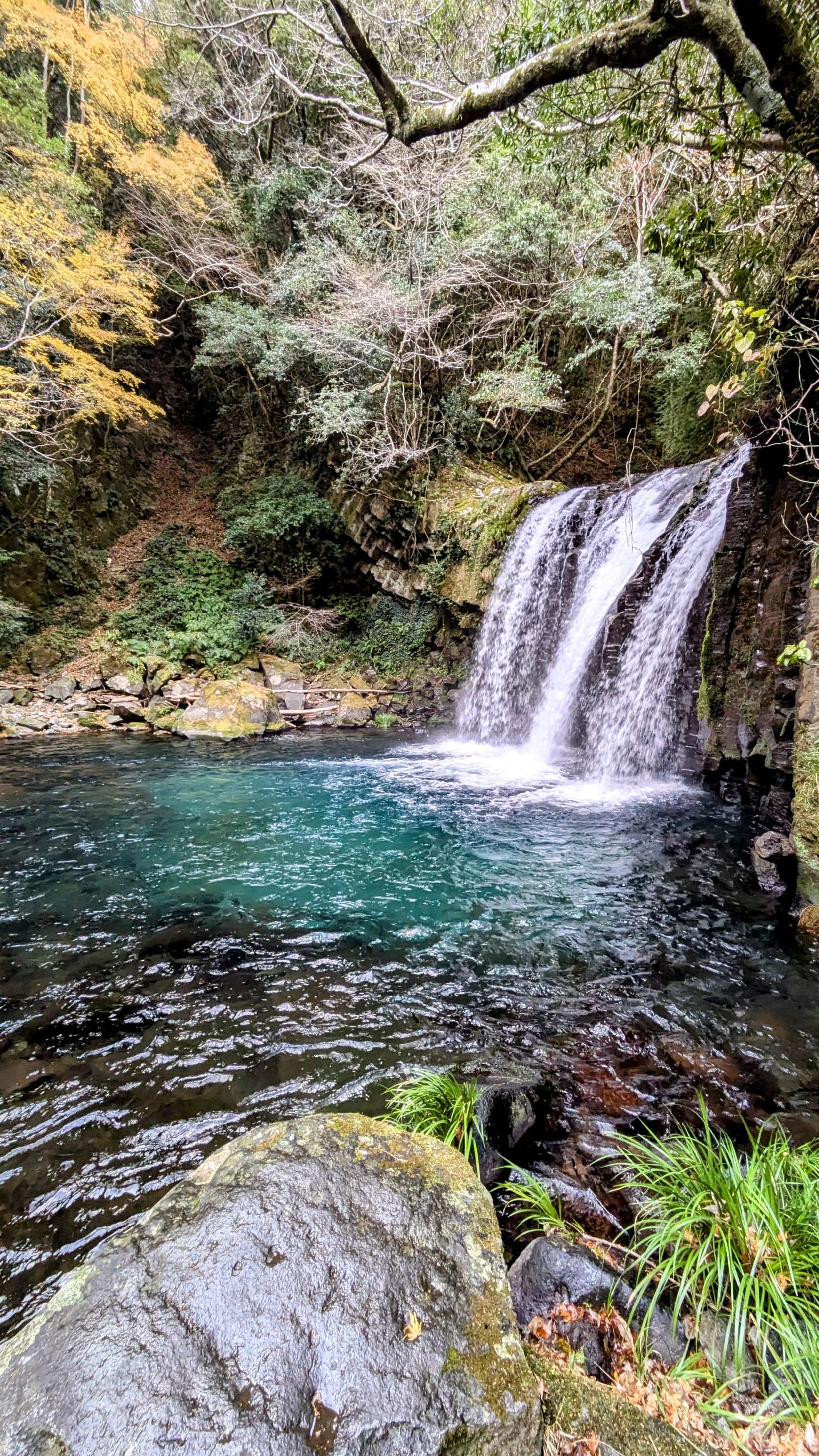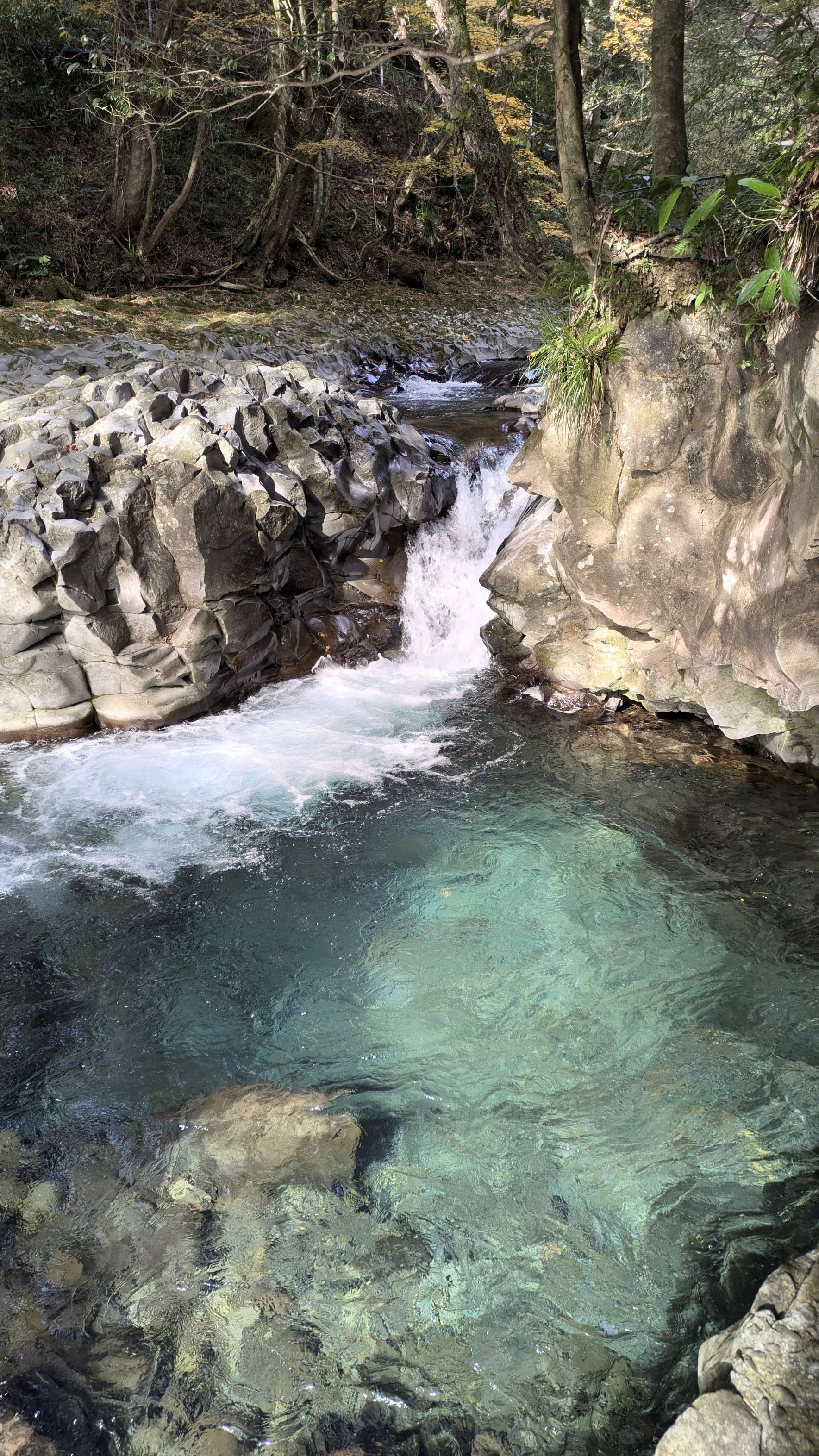 滝壺に日の光が差し込むと青く澄んでいてキレイでした。
