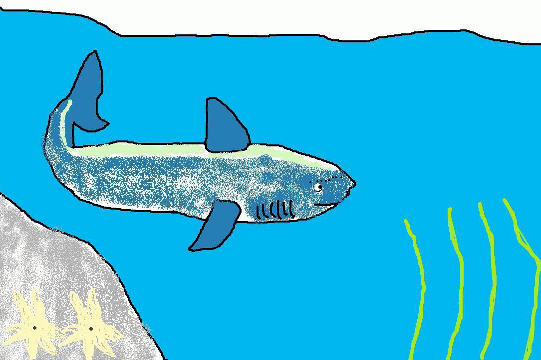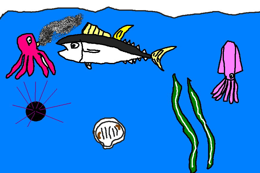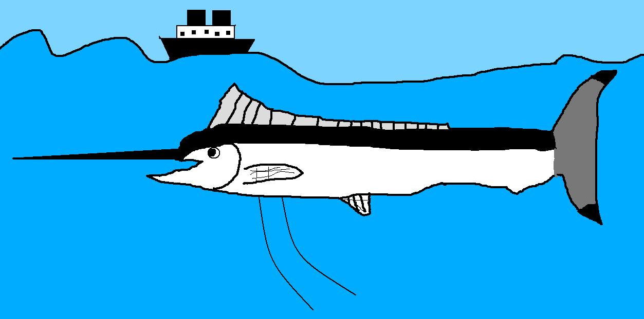 たあ君とちい坊は釣りがしたくてしょうがないこの前釣ったのはハゼ一匹と可愛らしいミニホタテだったけど心のなかにはこんなデカイのが泳いでいるぞカジキも船もモノトーンがいい感じ!たあ君作 「カジキと船」