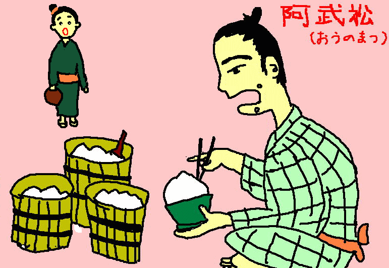 <落語・阿武松(おうのまつ)>関取・武隈の部屋に弟子入りした小車は大変な大食いだった。食前にでかい握り飯を七つ八つ平らげてから食膳に向かい食べ始める。何杯食べたか勘定できず、驚いたおかみさんは親方に暇を出せと言う。親方は一分金だけを小車に渡して部屋から追い出してしまう。途方にくれた小車は身投げを決心、死ぬ前に腹一杯喰おうと宿を取る。食べるのを見ていた女中は肝をつぶして主人に報告した。主人の橘屋は遠慮なくお食べ下さいと挨拶に出向き、事の次第を聴く。橘屋はたいへんな相撲好きだった。それでは私が、腹一杯食べれるよう米を送ってあげましょうと約束し、ご贔屓の関取:錣山(しころやま)の部屋へ案内する。錣山は小車の素質を一目で見抜き、小緑の名を与える。めしは遠慮なく喰えばいいと、橘屋の米の申し出は丁重に断った。小緑は順調に出世を重ね、ある日、旧師匠・武隈との取組に向かう。この相撲を見た殿様が阿武松の名を与え、六代目横綱となった・・・。主人公の食べっぷりの描写と、後半に登場する宿の主人と親方の人情味が好きで、ちょくちょく読む話です。ここしばらくは落語のリクエストが多く、舌が回らなくてたいへん。通常の昔話は、ゆっくり丁寧に言葉を置いていけば問題ないけど、落語は二人以上の声色を使い、テンポ良く掛け合うのが基本。寝っ転がって読むのは却ってしんどいので、自然と座って演じる?ことになり・・・なかなかつかれます。最近、私が読めないときは、ピンチヒッターでたあ君が文庫版の落語を読むらしい。あれ?漢字読めるの? 漢字テストは苦労してるのに・・・。そのうち、泣ける人情話も読んであげるからね!