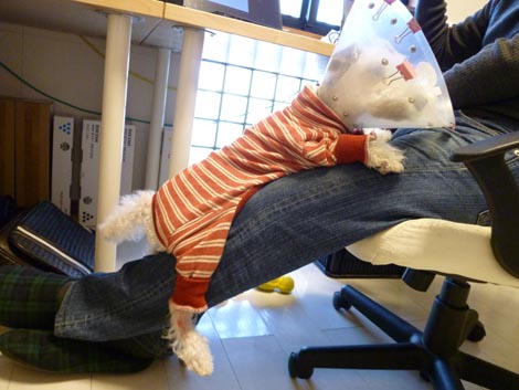 皆さんこんにちは!大吉です。Cikoママのお家へ来てもうすぐ3週間。小っちゃい毛むくじゃらのボクもすっかりここのペースに慣れて、色んな遊びを覚えました。お座りだって・・・・・ほら!この通り☆” この間、初めて獣医さんのところへ行ってきました。改装中だった診察室、何があるのかなぁ~????センセ~!あそぼー!・・・・かくれんぼかな?「大吉君、ちょっとチックンするよ!痛いけど我慢して!!」ん~?先生、チックン?楽しい遊び?なんだろなぁ?チックン、チックン!なんだろなぁ「もう終わったよ!ゴキゲンでいい子だったねえ」チックンしたの?先生、楽しいチックンしようよ~!「・・・・。もう診察台から降りてもいいよ」センセーッ!あ・そ・ぼ!!(注射の前も後もちっとも変わらないご機嫌ぶりに獣医さんの先生方全員苦笑気味でした) 「お注射が済んだら大人しくね!」って先生に言われたんだけど・・・・フワァ~、なんだか眠たいなぁ。。。そう言えばさっきお散歩中に可愛い女の子に「コレ、小っちゃい牛?」って言われた。。。牛ってなんだっけ?ボクは大吉。ボクは犬。ママとCikoは「この子はいつも独りごと言ってるし、寝てても寝言ばっかり。どこかに隠しファスナーがついてて中に、小さいおっちゃんが入ってたりして!」なんていうんだけど・・・・小さいおっちゃん?ってなんだろ?ボクは大吉。小っちゃくても立派に犬だもん。眠たいんだなぁ・・・・(スクスクと育って、うちに来た頃にはちゃんと収まっていた大吉座布団からお尻がこぼれてます)あ!!!Masaが帰って来た!!!あそぼ、あ そ ぼぉ。。。。あれ、Masaもお疲れみたい。ボクもマッサージのお手伝いを・・・あ、でも、手元が・・・ちょっとビミョーなところに。やっぱりボクも眠たいなぁ~。。。。 Ciko~!ねんね、ねんね!ボク眠いよぉ zzzzzz やっぱりボク、まだ赤ちゃんです眠い時はどうしても眠たいのです・・・・・ 今度は、アクティブなボクをみんなに見てもらえますように・・・フワァ~zzzzz