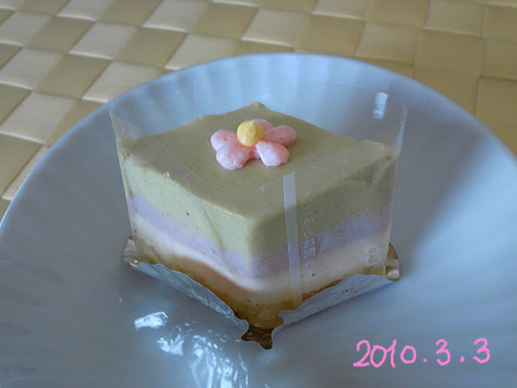 2010年の雛祭りは・・・・・・・・のんびり家で過ごすでもなく、お雛様もなく・・・・玄関に桃&菜の花&小手毬を生けてちょっぴり春な感じを出しつつ これだけは外せない!とゲットしたのがひし餅の形をした”雛ムース”。ピスタチオ&桃&バニラの3層のミニムース気分はすっかりGirly です。 ガールといえば我が家の寿々。今日のバーレーン戦の勝利の女神でした。家では気合を入れてサッカーを見るときに犬も一緒に観戦します。ゴールが決まったら”ハ~イターッチ”をするという我が家ルールあり。実家のワンコ大吉は「面倒っくっせぇなぁ~」とかなり手を抜いて応援する一方で我が家の寿々は毎度、嬉々として積極的に観戦に加わってくれる。で、今日の代表戦。前半何度も惜しいところでシュートが決まらず、ウズウズしていたので寿々と「ハイタッチの練習でもするか!」・・・とその瞬間、見事に岡崎の頭でゴール寿々はリハーサルなしの一発ハイタッチハイテンションのままハーフタイム。オットと私と寿々でお茶を飲みながら(寿々も好物なんです、薄めた緑茶)作戦タイム。その後の後半。ヤキモキしながら見ているも追加点が入らず。試合終了間近になって「寿々、今日はもう出番がないかもしれへんからもう一回ハイタッチの練習しよっか!?」と言った1分後。今度は本田の頭スゴイ確率です。私たち夫婦、単なる親バカなのかしら?(苦笑)寿々! Good job