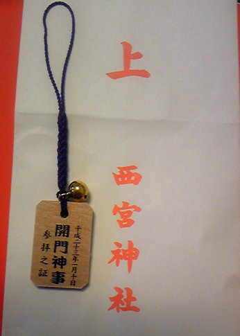 粉雪が舞っている朝です。昨日の夜9時頃に出かけたオット。向かうはえべっさんの福男競走の出走順抽選。10時、抽選申し込み開始。あんなに早くに行ってたのに申し込み順は345番。とりあえず抽選くじをひける1500人には入ったと第一報。と同時に「ここ、ワンセグ繋がりが悪いのでサッカーの進展状況メールしてね」と。辞書と格闘しつつテレビでイタリアの番組を見てたのを、辞書VSイタリア番組VSヨルダン戦に。あー、忙し!12時、サッカーが引き分け!と送るとほぼ、同時に外では抽選スタート。ドキドキ約半時間後、「アカンかったわぁ~」と言いつつ帰宅。なんでも出走くじ当たりの108人と予備グループの150人の人たちは9時頃から集まり始めて10時に申し込み、そこから出走ポジションを決めるまでずっと寒い中で待機らしい。朝5時半。スタート時の諸注意の放送が聞こえてきて飛び起きた。オペラグラス・・・・と、慌てて探すも出てこず。外から徐々に気合の入った声が大きくなってきて、見ていると、数秒後、太鼓の音と同時に猛烈なフラッシュ&雄叫び。ここから見てると一番、二番は白い上着の人、三番は黒の人?それとも赤の人?道路に溢れていた人(1500人以降の人たち)が順番にスタートする頃に私達も寿々と一緒に参拝にお出掛け。ちょうど米俵などの授与が始まったところでした。これまでに見たことのある顔の方!?一番福の方の野球のユニフォームロゴ、見覚えがあるような!?運の強い人たちが集まる中、のんびりと最後尾でお参りさせていただいて私までこんなものを頂いてしまいました帰ってテレビを見てると、一番福の方は数年前の福男さんの野球のチームメイトかな。あとの方も常連の福男さん。あれだけの人数から出走順を引き当てるだけでもすごいのに、二番福とか三番福に何度も入れるって、フィジカルも勿論のこと、本当に運の強い方なんでしょうね。運のおこぼれ、いただけた気分です。