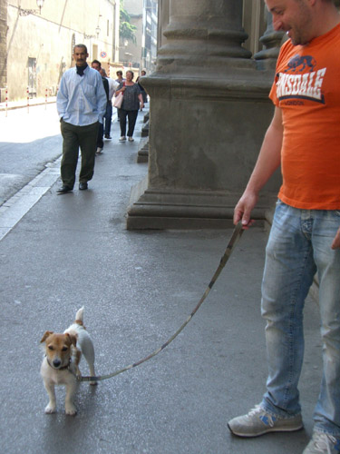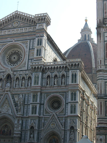 フィレンツェに行ったのにフィレンツェらしい写真がまだ上がってなかった・・・。フィレンツェといえば ↓ これですね。誰もが必ず訪れる花のドゥオーモ。 ここに来るとみんなカメラマンに変身~っ!少しでもいいアングルを求めて・・・・ひしめき合って・・・・てっぺんまで収めたいからちょっとでも高いところから・・・・って、おばさん!!そんなところに上がるのはどうでしょうか。(きちんと靴まで脱いでるって・・・?) このオバちゃんを含む中国からのツアーの一団が去ったあと同じポジションから撮ってみた。 なるほどぉ。台に上がると鐘楼の上まで入ったかなぁ。オバちゃんの欲求、ちょっとわかった気がした。イタリアって建物の外壁上部に装飾が施されていることが多い。周りの人たちがドゥオーモの写真ばっかり撮ってるのに、ふと振り向いて上を眺めてみるとこんなキレイなもの発見! ↑フィレンツェで有名なロッビア風の彩色テラコッタのひとつです。これ以外にもレリーフや壁面装飾など多数写真はあるのですが・・・・整理が出来たらまたupしますね。上ばっかり眺めてて危うく轢かれそうになりました。プップーと渇いたラッパの音。パッカパッカという音が雑踏にかき消されてたんです・・・。ごめんね、お馬さん。 私たち以外にも静かな熱い目線でドゥオーモを見上げる人、みぃつけた! ずーっと前から、雨の日も酷暑の日も雪の日も嵐の日もドゥオーモを見守り続けた人。 この目線の先はこんな風に見えているドゥオーモでした。