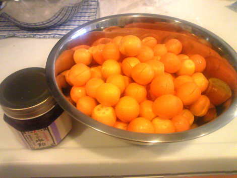 「庭の木に金色の実がいっぱいなったのを見てたらCikoさんを思い出してん・・・」と昨日の夜、雨の中を友人が山盛りいっぱいの金柑を持って来てくれた。私がこの2週間ズルズルと風邪を引き続け、ノドの調子がよくないのを知って"そういえば、金柑ってノドに良いって聞いたような"と、木いっぱいに金色の真ん丸に実った金柑を眺めた瞬間に思いついたとのこと。こういう心遣い、めちゃめちゃ嬉しい。で、早速。今朝は早くからキッチンに篭もってます。水でよく洗い、ヘタをカットして実に切り込みを入れ熱湯で少し湯がきお湯から上げて、一度しっかり冷ます。尼崎の飴の老舗 ヒノデ阿免本舗の水あめまで一緒に持ってきてくださったのでお砂糖でなく、この水あめで炊いてみようっと♪もし、美味しく炊き上がったら「振る舞いキンカン」します。(笑)Cikoのお近くの方、ご希望があればご連絡くださ~い!で、只今冷却待ち。家じゅうに金柑の甘い匂いが漂ってます。柑橘系すべてが大好物の我が家のワンコ寿々はいい匂いにテンションが上がりいつもなら寝ているこの時間も一人で「体育の時間」とばかりに走り回ってゴキゲンゴキゲン。台所に立ってひたすら同じ作業を繰り返す・・・・・なんだかすごい久しぶりのこの感覚、、、、で、思い出した。ミラノにいるときってテレビもつけず歌いながら、お喋りしながらこうして何時間もオリーブの種抜きしたり、パスタの生地をこねて作ったりと食べるための作業を楽しんでやってたよなぁって。こういった時間、長らく忘れてた気がする。忘れてたついでに、今思い出した!明日の本番の暗譜!!!!!!