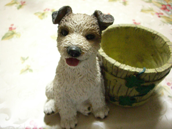 今日の午後のこと。歌のレッスンに来ていたEちゃんと歌いはじめる前にお喋りしていた時、見つけたのです。それはピアノの上に10年ほど前からずっといたのです。いつの日も大人しく、とってもお行儀良く、ご機嫌な様子で・・・。で・・・・・気づかなかったのが不思議なのに、今日まで気づかなかったのですワタクシ。彼もヤツと同じ変な座り方をするワイヤーフォックステリアだったってことに。 ちなみにうしろ姿はこんなの。 右足がお尻からはみ出してます。。。ヤツというのは当然、我が家の破壊ダー、大吉くん。彼はよく変な座り方をしているのです。最初は偶然かと思ったのだけど、ご飯の前や何かをおねだりする時にはピシッ!と座っている・・・ということは、、、と思ってちょっと狙ってみた。やっぱり!!気を抜いてボーっと座っていると こんな具合にオネエ座りに。またある時は、 鼻の穴まで全開でリラックス。先日、お散歩中に小さな子供達に囲まれてご満悦のひとときも、 小さくてよくわかんない・・・・?では、部分アップで!足にご注目♪ ね、やっぱりオネエ座りでしょ?!でも、気合の入ってる時はきちんと座って「ボク、できるでしょっ」な表情。 ご褒美のおやつを前にしたもんなら、もっとテンションアップ!!耳まで両方立っちゃいます。 今日、鉢カバーのワイヤー君を見つけることが出来てCikoはとっても幸せです。大吉に出会う前からワイヤーにご縁があったなんて!それに、あの座り方こそがワイヤーのスタンダードだってわかったんですもの。 以前飼っていたコロちゃんはあの座り方しなかったけど、ほかの犬種でもスタンダードなのかな?