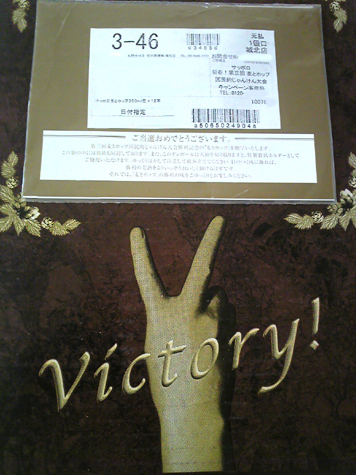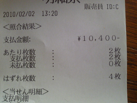 今日のネタの前に先日のチョコミルクの続編を。みなさま、ありがとうございました「日記読んだよ~!」「うちの近所も探してみるね」「このまえ近くのスーパーで見たからこれから行ってみるね!あったらすぐに連絡します」「発見したので買い占めました」などなどなどたくさんのご連絡を頂き、チョコミルクも送っていただけるということになりました。ホントに感謝ですと同時にブログってすごいなぁって今更ながら感じ入りました。さて。今日のこと。ズバリBINGOです。私はロト6の発売スタート以来ずーっと同じ数字で買い続けています。たまに軸にする数字を固定して別のパターンで買い足したりもしつつ。オットMasaがそれ関係の本や攻略ソフトを出版してたりもしたのですが、自分で買う分は自力念力で数字を決めて何年間も同じ数字を買い続けてきたのです。それがね・・・・買ったらそれだけでひと仕事した気分になって当選をチェックして引き換えに行くというのを忘れがちなんです、私。昨日のこと。片付けている最中に6枚のロト6のくじを発見。「忘れちゃいけない!」と今日でかけたときに「当たってないかもしれないんですけど・・・」と出すとなんとそのうち2枚もアタリえべっさんのご近所さんになってからBingo率が上がってます。(ウフ)ご近所サービスならぬご近所ご利益おこぼれみたいなのってあるのかな?