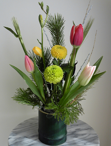 明日から始まる十日戎(通称えべっさん)。今年は日曜が宵戎、祝日に十日、残り福が平日・・・とあってか、なぜか一日前倒しで準備がスタート。町内の規定では9日すなわち明日の朝から準備のためにご近所の道が通行止め、そして我が家も車が使えなくなる予定だったのに、お昼過ぎに帰宅したらすでに、完全に包囲されちゃってた。駅前からお宮さんまで隙間なく露店が並び、試し焼きも始まってるので家の中にいてもイカ焼き、ベビーカステラ、焼肉・・・色んな匂いが漂ってきてる。えべっさんの時期、来客も多いことだし!とお正月のお花から少しアレンジしてお花を生け直し。 早くも春を告げるチューリップがでていたので、早速。お外の風は冷たいけど、お花の周りは春な雰囲気です。えべっさんにお参りの方、どうぞCiko宅へもお立ち寄りください。あったかい飲み物とワイン色々取り揃えてお待ちしておりま~す
