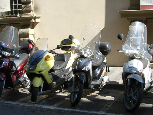 イタリア人というと、どんなイメージをお持ちでしょう?ハイ!イタリアにまだ足を踏み入れていない日本人のあなた!どうですか?そこの、イタリア人に囲まれて過ごしているあなたは?あ、もちろん純イタリア人のあなたも自国人のイメージってどんなのでしょう?一昔前まで「イタリア人はおおらかで、細かいことは気にしないで、いつもカンツォーネを歌っているご陽気民族」なんてイメージが日本でも先行していたかと思います。確かにいつも歌を歌っていて(しかも鼻歌なんてレベルじゃなく結構なマジ声で)↑こんな人ならCikoの周りの日本人にもいます。約束の時間にはルーズで(出かける前にシャワーしてドレスアップして登場してくれる)↑このタイプも然り。女性には必ず声をかけ(初対面でもCiao bella!だけでなく手を取り、肩を抱いて密着度の高い挨拶をする人も稀に・・・中年以上の男性に多い、かな。でも若者は殆どそんなことしない!特に中部以北では)「Va bene,perfetto!!」(よっしゃ、カンペキ!)を口癖としている というステレオタイプのイメージぴったりの人もいるかと思いますが、私の周りのイタリア人を見る限り、そうでない(どころかイメージとは逆の)タイプの人が意外に多いように思います。今回の旅行中にも律儀なバージョンのイタリアらしい光景にいくつか遭遇しました。バイクの駐輪スペースにて。 線の中に収まるように、かつ角度までお隣さんと揃うように停められてると思いません?と、そこへ一人のおじちゃんが。このいいお天気に相応しくパキッとしたマリンカラーでのいでたち。どうやら自分のバイクを停めるスペースを考えあぐねている様子。 (よーく見ると紺の2台とその向こうのシルバーのあいだに1台分のスペースが!)彼のバイクはちょっぴり幅広・・・この場で暫し考えたあと紺の2台を少し赤いバイク寄りに移動させて、無事に駐車スペースに収まりました。もちろん周りのバイクと鼻先を線上に揃え、まっすぐ揃うように何度も置き直して。満足気に歩き出した彼、鼻歌まじりにドゥオーモ方向へ。 と、そこにはまた新たなる問題が。鼻歌からそのまま文句の独り言へと変わりました。誰も見ていないのに(いや、私はコッソリ見てたけど)身振り手ぶりつきでブツブツと文句。 バンパーはきっちりとくっついてBMWとルノーのキッス状態。 おもむろにBMWの扉を開け、ハンドルを回して・・・・車を外から押し始めました。頑張ること5分。。。。前の車とのあいだに少しの隙間は出来たものの、さすがにこれでは出られないと観念した様子。 あきらめたのでしょうか。どこかに電話をして立ち去ってしまいました。(多分車のロックもしないまま!?)イタリアの車、最近でこそキレイな車が増えたと思いますがそれでもバンパーがボディにめり込んでるのも少なくないと思います。きっとこのルノーも目一杯バンパーが凹みきっていたのでしょうね。このおじちゃんは車をゆっくりと手で押してトライしていましたが、都市部の朝のラッシュ時など自分の車のエンジンをかけて、事も無げに前後の車にガ~ンッ!ガンッ!ってぶつけてぶつけて車を出す人をよく見かけます。日本で「バンパーにちょっと傷がいった!」と高速道路で平気で渋滞を起こす人たちが見たらどんな風に言うかしら・・・なんて考えた私、意地悪でしょうか?それともイタリア感覚が身についたとでも言えるのでしょうか?(苦笑)でも、こんな私もバンパーが思いっきり凹んでめり込んでしまったら・・・やっぱりイヤかなぁ。