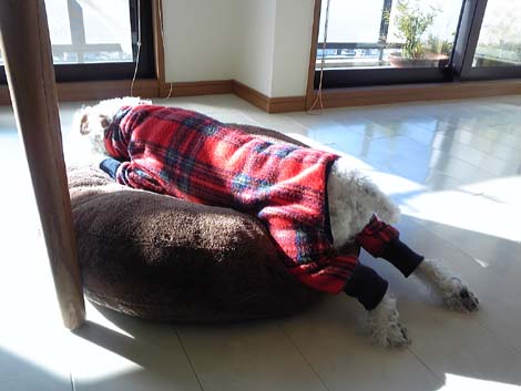 昨日「我が家の犬、寿々が冬眠に入りました」と書いたらマイミクのkeychanさんから「♪犬は喜び庭かけまわり~♪」じゃなかった???とのコメントを頂き、試しに寝ている寿々を起こして強引に【体育の時間】を実施。ボールを投げて「持ってこい!」とロープの引張りっこを15分。と、突然プツンとスイッチが切れたかのようにため息ひとつして、ダラダラと歩いて再び日向へ。さっきとは少し位置の変わったベストポジションへクッションを引っ張っていき鼻で押して微調整も完了。この一連の動き、かなり手馴れた感あり。少し前までは”大福餅”のように丸くなって寝ていたのですが今は”伸し餅”です。フリースの長袖長ズボンのくせにこんなに寒がって・・・。これ以上冷え込んできたらどうやって冬を越すつもりかしら?