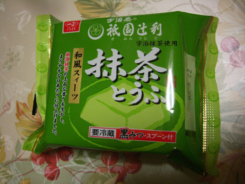 この間、よく行くスーパーで見慣れないものをみつけた。売り場は”豆腐、油揚げ”コーナーの棚。売り場を歩いていて「え?」と何かが目の端に引っかかった。男前豆腐シリーズでもないし、沖縄豆腐コーナーでもないし・・・・京都のおあげさんでもないし・・・・でも、何か見たことの無いようなものが見えたような気がした。棚の前をよく見るとこんなものがありました。豆腐のコーナーに珍しいこんな色で。 この横には「ほうじ茶豆腐」も。並びからすると胡麻(ゴマ)豆腐→胡桃(くるみ)豆腐→この緑のパッケージ。売り場で可能な限り味を想像してみた・・・・・イメージできない!これは食べてみるしかない!と、抹茶豆腐・ほうじ茶豆腐ともにお買い上げ。食べてみました。 黒蜜付きですが、黒蜜なしでも十分に美味しい!!!!!!豆腐といわれたら「えぇぇぇ?」と感じます・・・・そういう意味では豆腐じゃない、かな。(そういうってどういう、なんて突っ込まないでね)味、食感ともに立派なお菓子です。かといってプリンやババロア、ムースとかゼリーとも違うし・・・・・言うなれば和菓子って感じです。で、はたと思い出した。売り場の置いてた場所。そうです!食感といい風味といいゴマ豆腐のそれ系統です。京都のお寺でいただく精進料理で出されるような【ゴマのおとふ】。あれのお抹茶バージョンです。これから暖かくなってきたらこのお豆腐、頻繁に我が家に登場しそうです・・・・あ、でもお財布に余裕のあるとき限定ですが。。。。