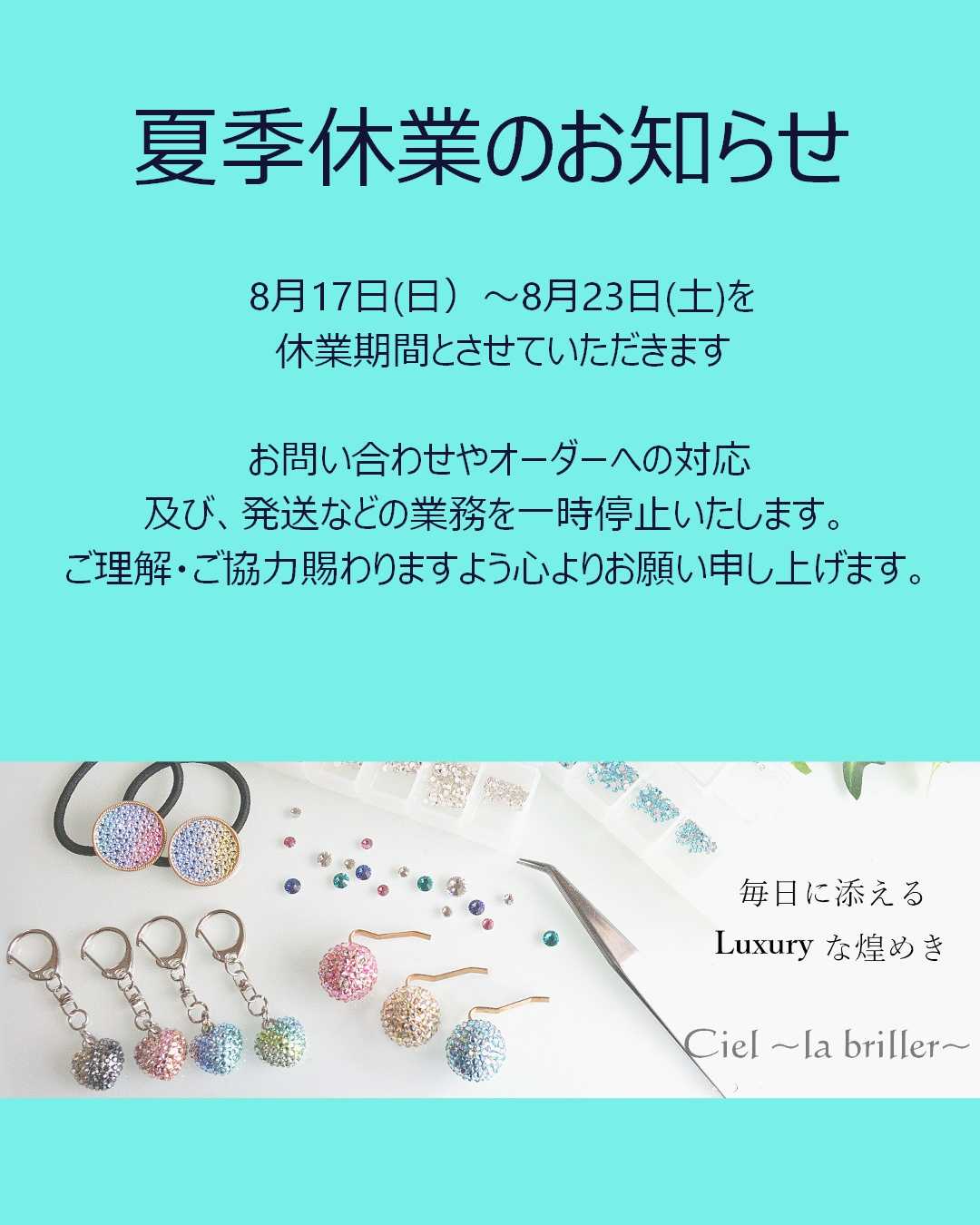 バナーを1日1回クリックして頂けると励みになります いつもご訪問応援ありがとうございます♡ デコクリエイターのCiel cheeです【Luxury】な煌めきを添えて身につけるだけで毎日が変わる自分へのご褒美に大切な人へのプレゼントに煌めく瞬間を永遠に世界にたった1つ!フォトデコレーション承り中お気に入りがきっと見つかる♡デコレーションショップ【Ciel ~la briller~】シエルラブリエ ♦♦♦♦♦♦SHOP♦♦♦♦♦♦Creema店minne店♦♦♦♦♦♦♦♦♦♦♦♦︎♦♦♦♦ 今日から学校が始まりました。息子は初日から7時間授業。お弁当持って登校です。娘は2時間授業。明後日から給食が始まります。息子は明日から学力試験。娘はその翌週から学力試験。夏休みが終わったとたんテストです。夏休み、どれだけ勉強したかがきっと結果に出るのでしょうね。さて、ジュエルバンスクリップ。4カラーをショップで販売開始です。約11cmと大きめのバンスクリップです。バンスクリップは再販なし、在庫ある分だけです。この写真に載っているものでもないカラーがあります。気になるカラーがありましたらお早めにお買い求めください!3つギャラリーAGITOさまでも委託販売させていただいています。在庫はギャラリーAGITOさまへお問い合わせください。【委託先】ギャラリーAGITO東京都世田谷区桜丘2-21-7 メゾンリエールC平日AM11:00~17:00定休日 土日・祝(場合によって土日祝日は営業する日有り 土日AM12:00~18:00)Instagram @gallery_agito心煌めくデコアイテムをCreemaとminneで販売していますウェルカムボードなどのセレモニー写真、大切なペットのフォトデコレーションも承っております。詳細はショップページからご確認下さい。Ciel ~la briller~ Creema Ciel ~la briller~ minneあなたの「お気に入り❤」がみつかりますようにココナラココナラは完全オーダーメイドお持ち込みアイテムへのデコレーションが多いです。お手持ちのアイテムにご希望のデザインを。あなただけの完全オリジナルが作れます。*minne、Creemaでもオーダーご相談受付OKです! ご利用しやすいサイトからお問い合わせくださいInstagramCiel ~la briller~ ギャラリーになってます覗きに来てくださいねお問い合わせはショップまたはインスタグラムよりお願い致します。敬老の日 【5年連続受賞 楽天グルメ大賞】\枚数限定★200円OFFクーポン配布中/【天然高級魚 銀だら入り西京漬・粕漬お買得セット 5~8切入】お中元 御中元 暑中見舞い 夏ギフト ギフト プレゼント 送料無料 贈り物 お祝 内祝 お礼 高級感 切り身 天然魚 漬魚 漬け魚価格:3,580円~(税込、送料無料) (2025/8/25時点)\P最大10倍/ 早割 敬老の日 プレゼント 和菓子 お菓子 スイーツ ギフト 孫 孫から 施設 80代 70代 おばあちゃん 誕生日 食べ物 高級 菓子 詰め合わせ 御祝 御供 送料無料 スイーツグランプリ1位 岐阜中津川 栗きんとん お取り寄せ 岐阜中津川 栗 100% 栗きんとん 10個入価格:3,560円(税込、送料別) (2025/8/25時点)敬老の日 プレゼント お菓子 お中元 残暑見舞い ギフト スイーツ 高級 誕生日プレゼント 凛菓 ティラミス 詰め合わせ 4~12個 抹茶スイーツ ほうじ茶 栗 黒胡麻 ケーキ 和菓子 ドルチェ 瓶 おしゃれ 人気 内祝い お返し 出産祝い お礼 お取り寄せ 誕生日スイーツ 送料無料価格:3,580円~(税込、送料無料) (2025/8/25時点)