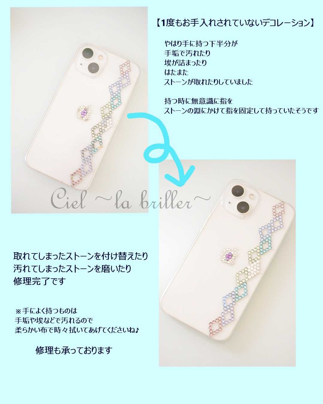 バナーを1日1回クリックして頂けると励みになります いつもご訪問応援ありがとうございます♡ デコクリエイターのCiel cheeです【Luxury】な煌めきを添えて身につけるだけで毎日が変わる自分へのご褒美に大切な人へのプレゼントに煌めく瞬間を永遠に世界にたった1つ!フォトデコレーション承り中お気に入りがきっと見つかる♡デコレーションショップ【Ciel ~la briller~】シエルラブリエ ♦♦♦♦♦♦SHOP♦♦♦♦♦♦Creema店minne店♦♦♦♦♦♦♦♦♦♦♦♦︎♦♦♦♦ 今日は寒くて寒くて。。今季初めての暖房を入れました。気温13度ですって!雨が降るとより冷えますね。さて、本日は修理、メンテナンスのお話。スマホケースの修理を承りました。施工してから2年。1度もお手入れせず、時々落としたりされていたスマホケースデコレーション。ストーンがいくつか取れ、ストーンの周りが黒ずんでいます。毎日手に持つものは、やはり汚れが目立ちます。見事に下半分だけ汚れているのがお判りでしょうか。上はストーンの取れもなく、軽く拭いただけで本来の輝きに戻りました。下は画像内にも記載していますが、スマホを持つときに指をストッパーのようにストーンにかけて持っていたそうで。弱い力ですが、2年間、毎日何時間も負担をかけていたら取れてしまいます。特にこのポイントデコは、全面デコのように接着剤を全面に塗らないので全面デコに比べたらどうしても取れやすくなってしまいます。ほんの数ミリのストーンを使うデコレーション。とっても繊細なので衝撃には気を付けてご利用いただければ幸いです。長く愛用していただく為にストーンからはみ出てしまわない限界ギリギリの量の接着剤を使い取れないようにこれからも努力してまいります。隙間にたまった汚れを取り取れてしまったストーンを貼り直し磨いたら修理完了です。ストーンが曇ってきた?と感じたら柔らかい布で拭き上げてみてくださいね。それだけでぐっときれいに保つことができます!お困りのことがありましたらお気軽にご相談ください。心煌めくデコアイテムをCreemaとminneで販売していますウェルカムボードなどのセレモニー写真、大切なペットのフォトデコレーションも承っております。詳細はショップページからご確認下さい。Ciel ~la briller~ Creema Ciel ~la briller~ minneあなたの「お気に入り❤」がみつかりますようにココナラココナラは完全オーダーメイドお持ち込みアイテムへのデコレーションが多いです。お手持ちのアイテムにご希望のデザインを。あなただけの完全オリジナルが作れます。*minne、Creemaでもオーダーご相談受付OKです! ご利用しやすいサイトからお問い合わせくださいInstagramCiel ~la briller~ ギャラリーになってます覗きに来てくださいねお問い合わせはショップまたはインスタグラムよりお願い致します。ハロウィン ライト 電池式 3m 20LED 飾り イルミネーション 壁 装飾 屋外 オーナメント 窓 庭 部屋 玄関 自宅 ガーデン フェンス 電飾 キャンプ パーティー LED カボチャ かぼちゃ おばけ 電球 デコレーション 店 ホテル こうもり 仮装 吊り下げ オレンジ ガーランド価格:1,280円(税込、送料無料) (2025/10/25時点)ハロウィン 飾り セット おしゃれ 飾り付け タペストリー ハロウィーン 飾りつけ 背景布 ハローウィン飾り ハロウィンのタペストリー ハロウイン 壁掛け ハロウィン装飾 フォトスポット フォトブース ハロウィン飾り付け ハローウィン 仮装 狼 マスク 装飾 ハロウィン雑貨価格:1,452円~(税込、送料別) (2025/10/25時点)\本日店内EVENT/ 送料無料 チェアパッド クッション キャットデザイン 椅子 いす チェアクッション カバー 猫 ネコ ねこ グッズ かわいい おしゃれ インテリア ディスプレイ シートクッション チェアマット 室内 新生活 丸型 猫の日 バレンタイン メール便価格:1,881円(税込、送料無料) (2025/10/25時点)
